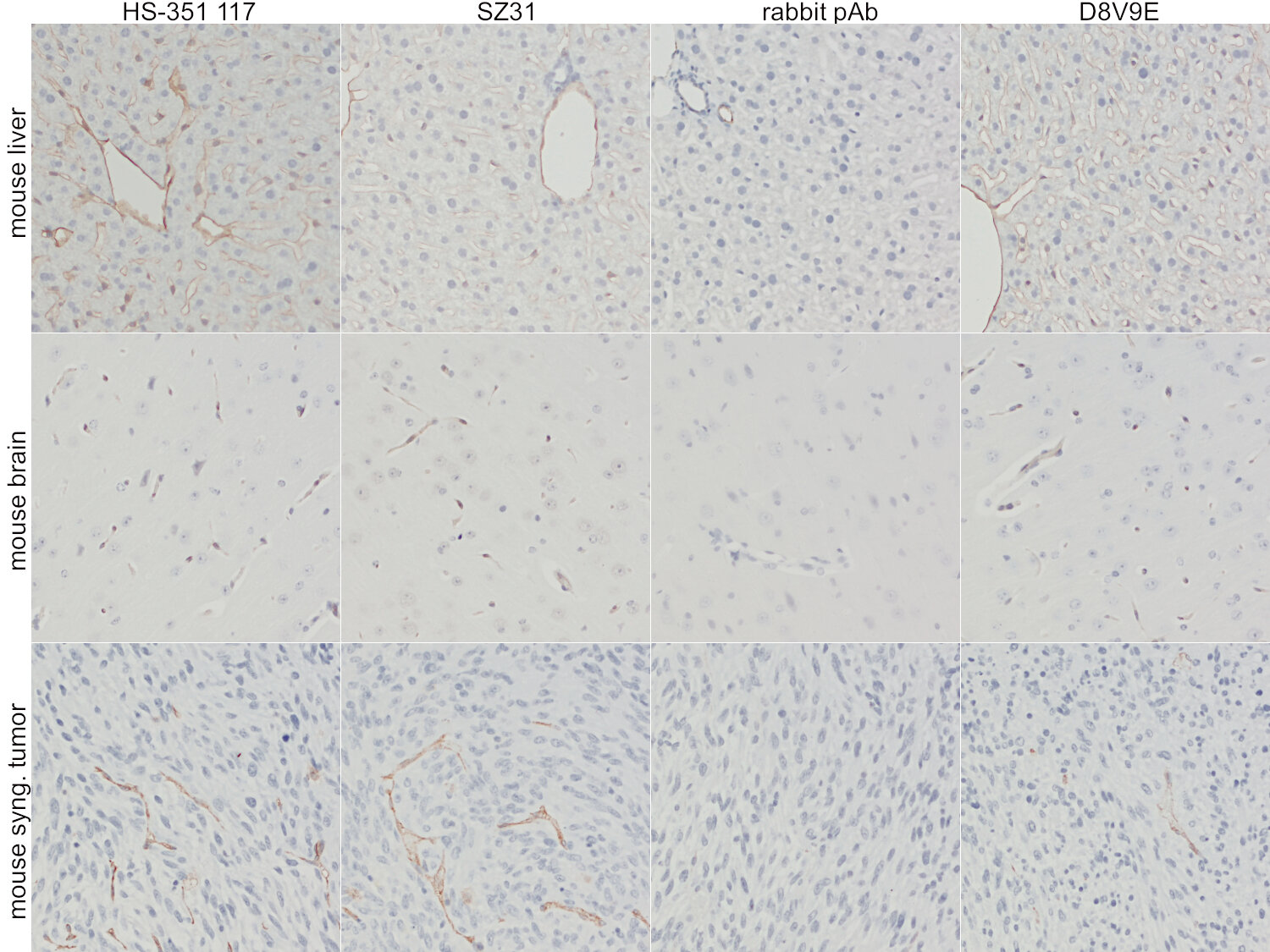 Figure 4: First row: Anti-CD31 staining in FFPE mouse liver sections. Second row: Anti-CD31 staining in FFPE mouse brain sections. Third row: Anti-CD31 staining in FFPE sections of mouse breast syngeneic tumor. First column: anti-mouse CD31 rat mAb HS-351 117 (1:1000), Second column: anti-mouse CD31 rat mAb SZ31 (competitor antibody; 1:10). Third column: anti-mouse CD31 rb pAb (competitor antibody; 1:50). Fourth column: anti-mouse CD31 rabbit mAb D8V9E (competitor antibody; 1:100).