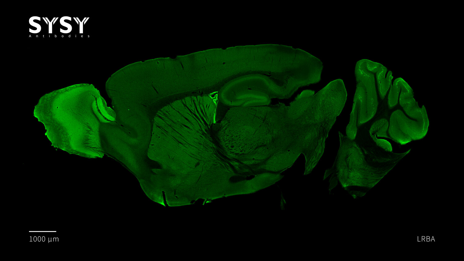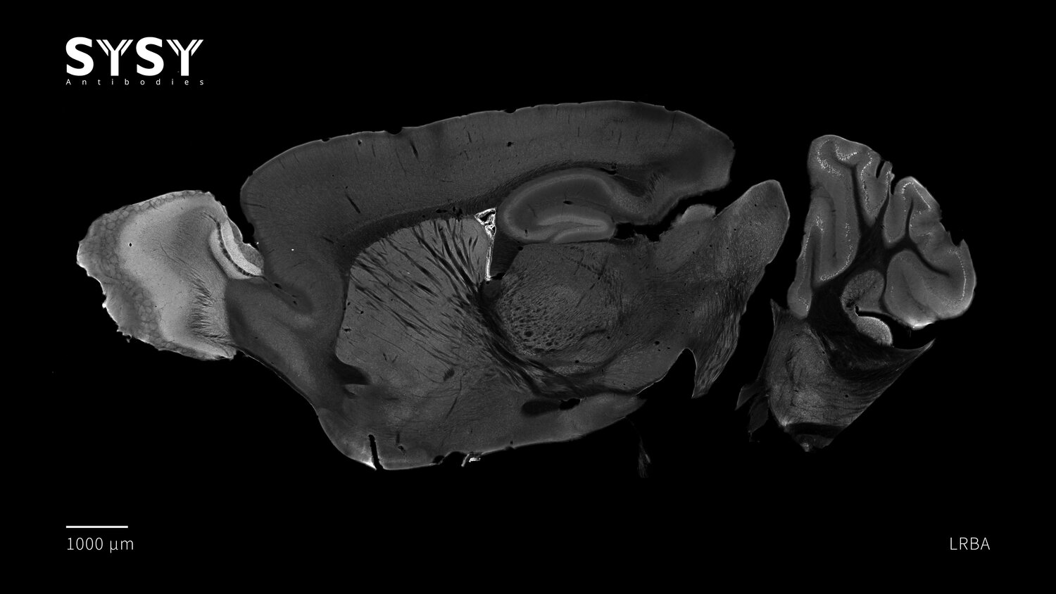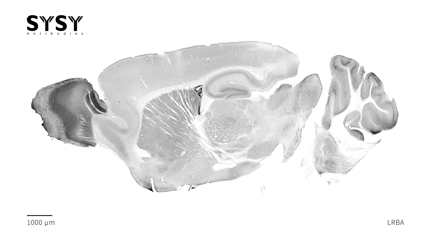 Indirect immunostaining of a formaldehyde fixed sagittal mouse brain section with guinea pig anti-LRBA antibody (cat. no. 524 005, dilution 1 : 1000).