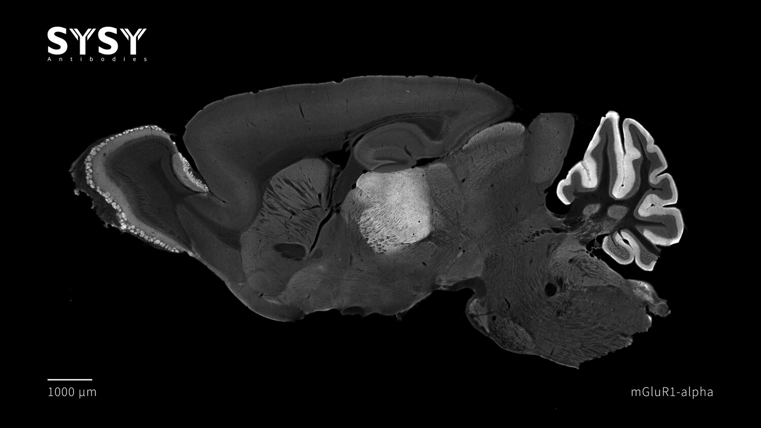 Indirect immunostaining of formaldehyde fixed sagittal mouse brain section with rabbit anti-mGluR1-alpha (cat. no. 191 003, dilution 1 : 500).