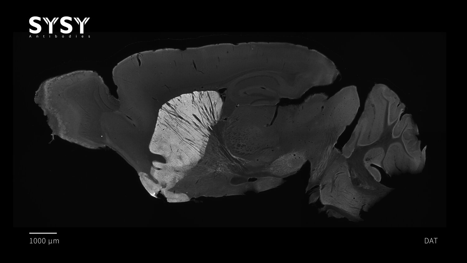 Indirect immunostaining of a formaldehyde fixed sagittal mouse brain section with mouse anti-DAT antibody (cat. no. 284 011, dilution 1 : 500).