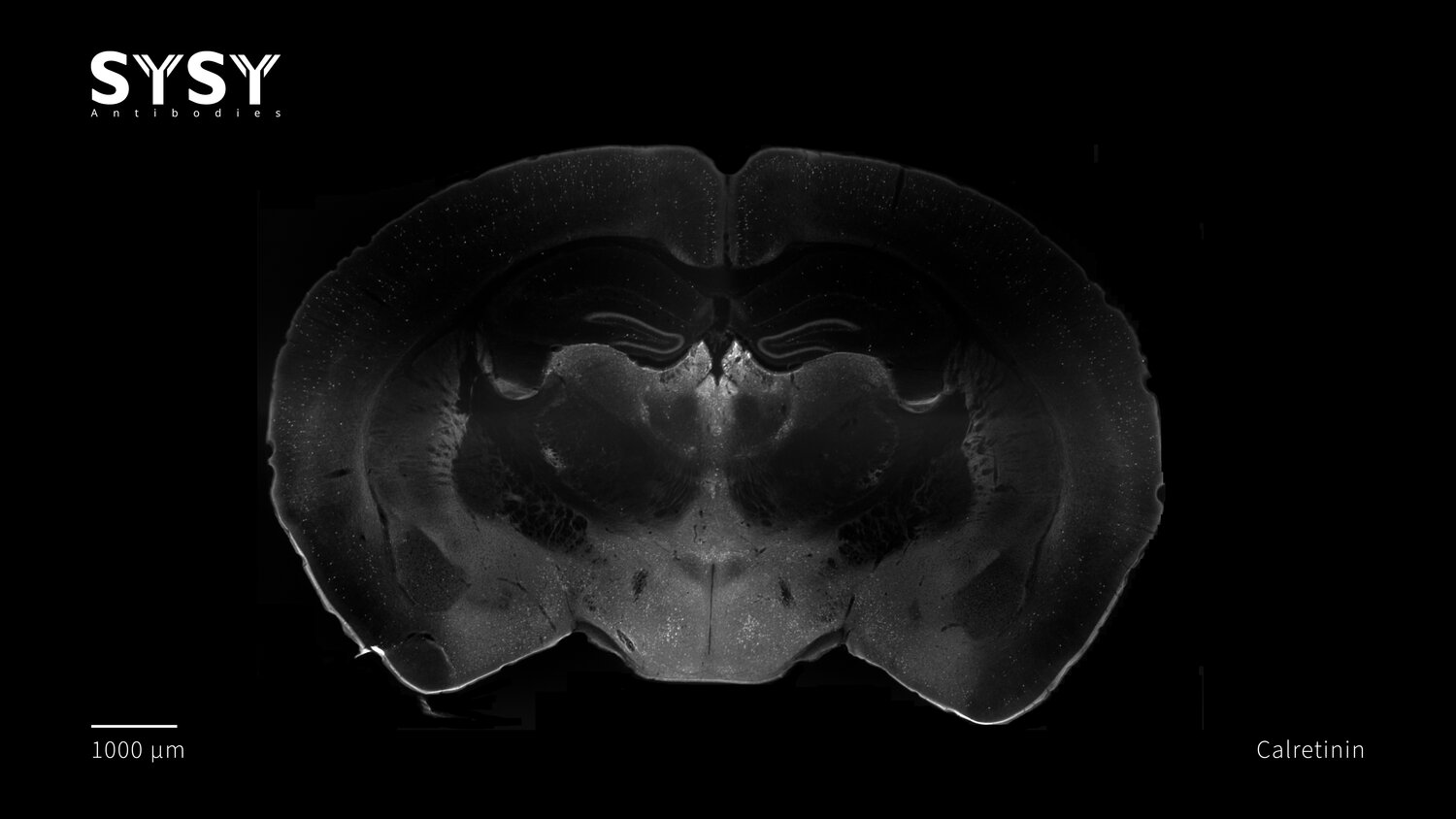 Indirect immunostaining of a formaldehyde fixed coronal mouse brain section with mouse anti-Calretinin antibody (cat. no. 214 111, dilution 1 : 500).
