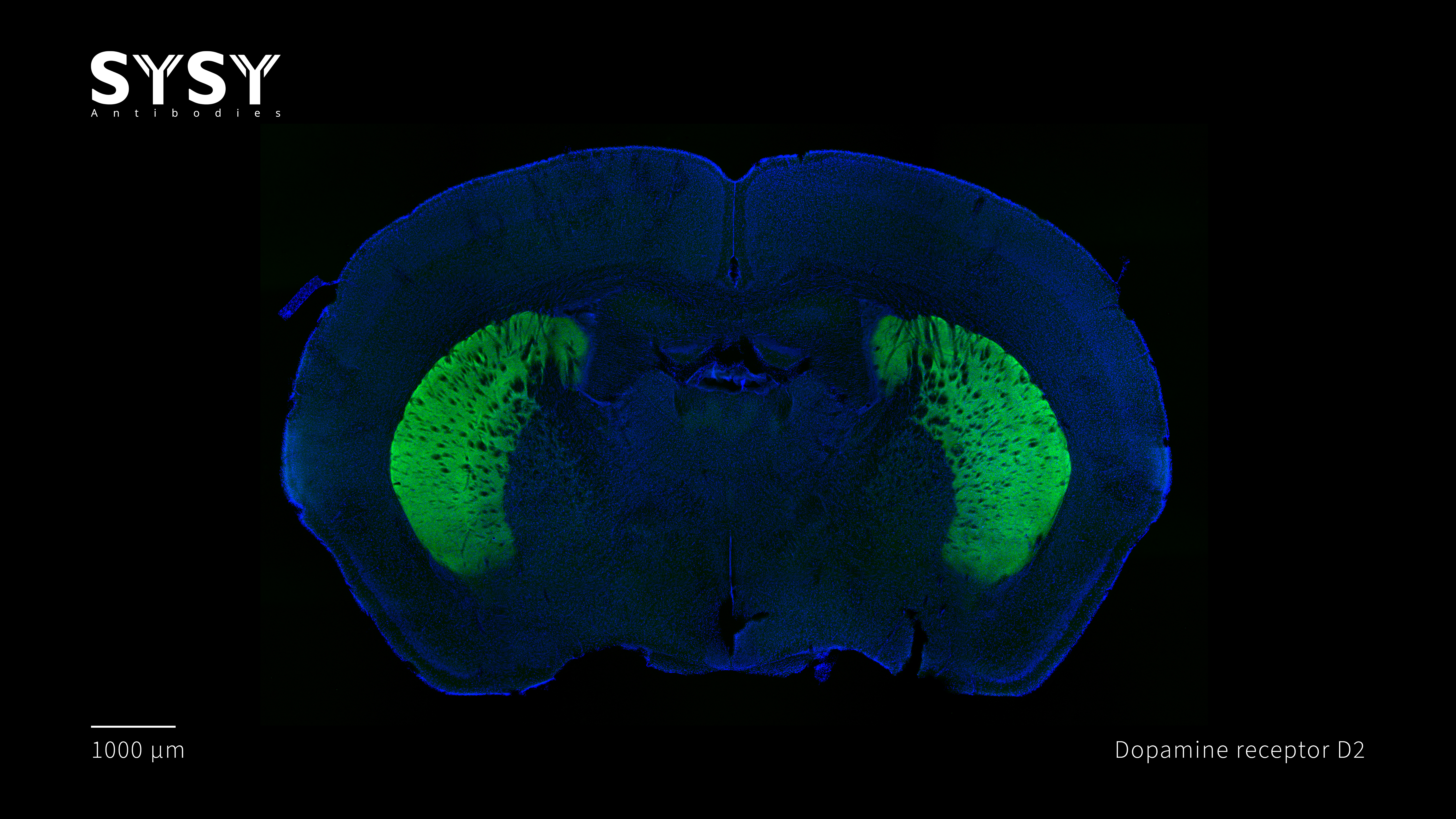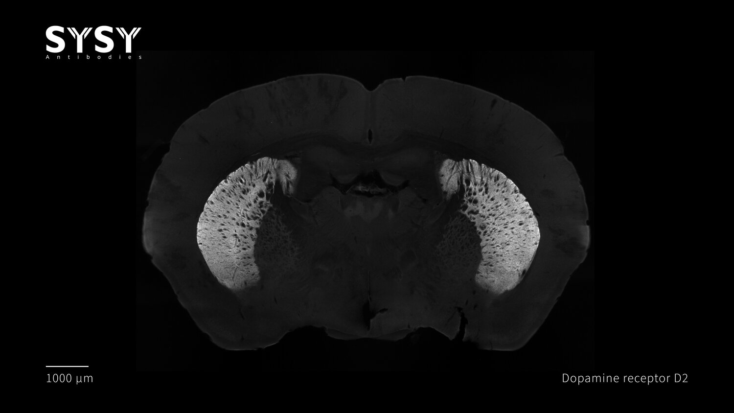Indirect immunostaining of a formaldehyde fixed coronal mouse brain section with rabbit anti-Dopamine receptor D2 antibody (cat. no. 376 203, dilution 1 : 500).