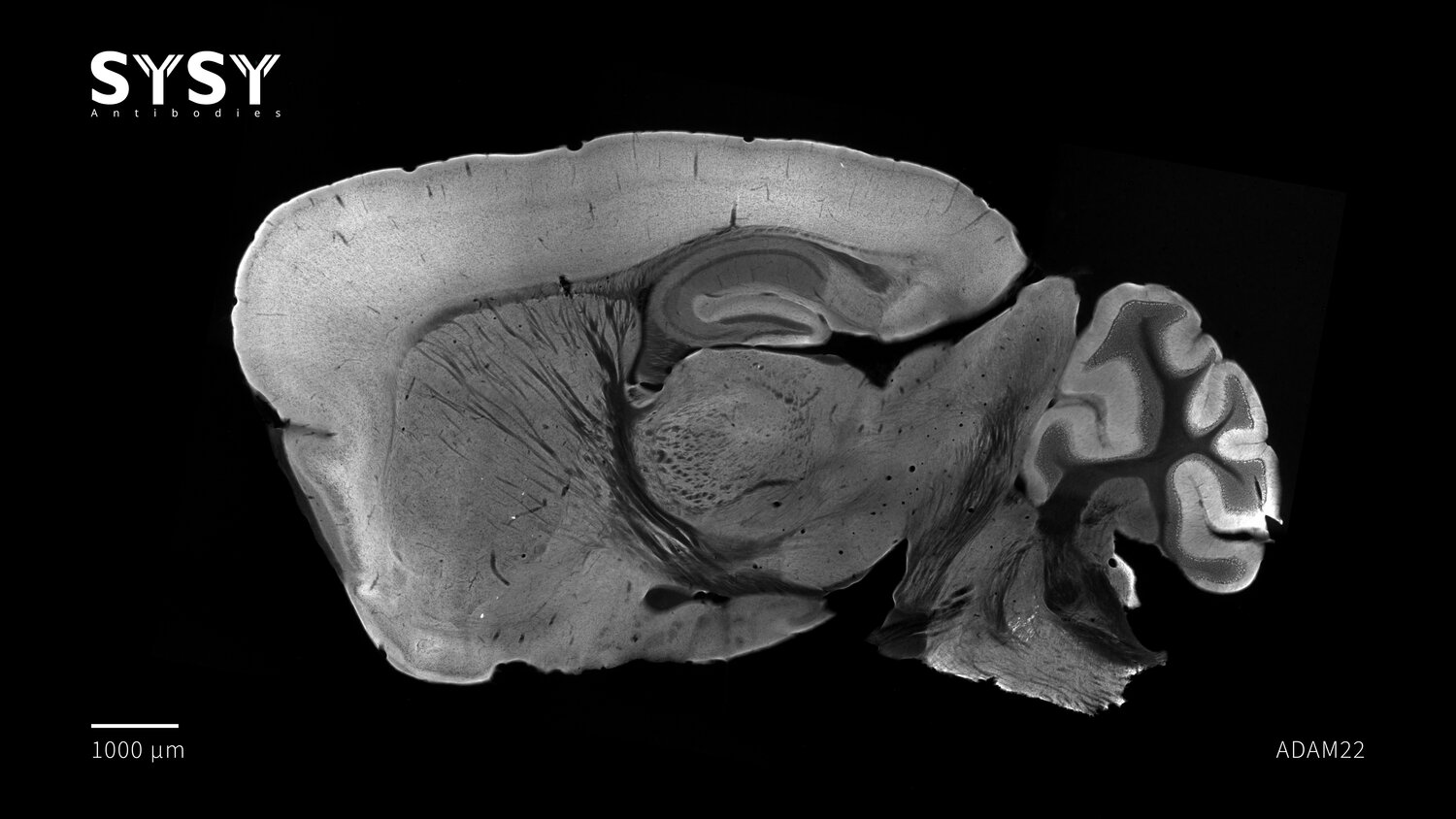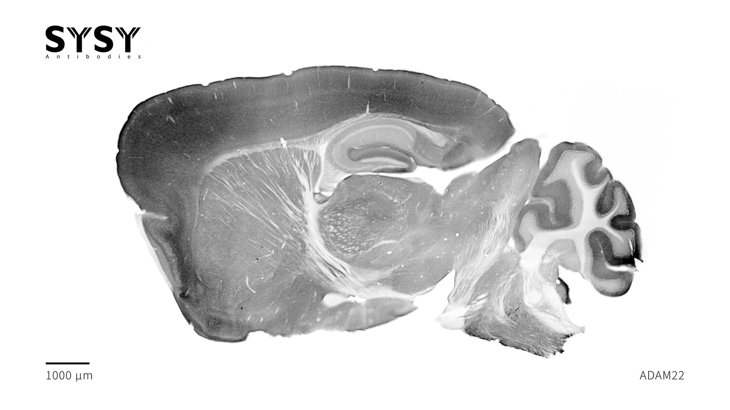Indirect immunostaining of a formaldehyde fixed sagittal mouse brain section with guinea pig anti-ADAM22 antibody (cat. no. 317 005, dilution 1 : 500).