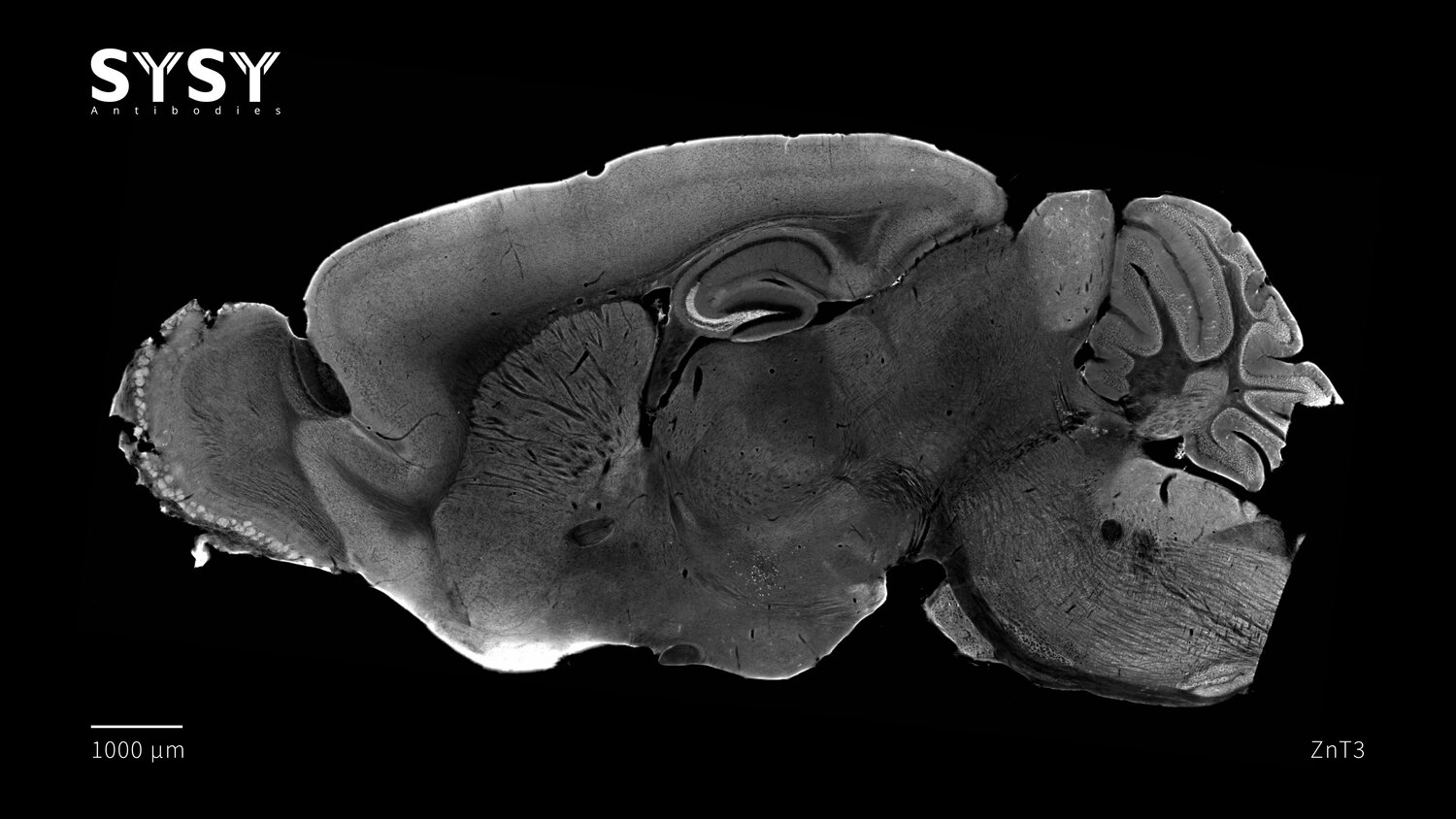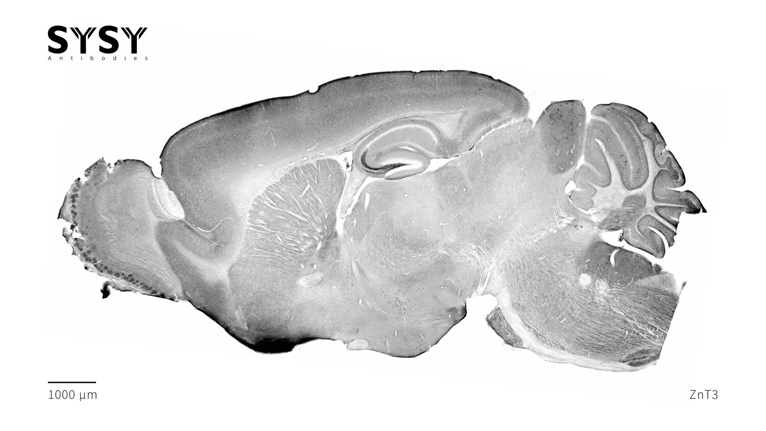 Indirect immunostaining of a formaldehyde fixed sagittal mouse brain section with mouse anti-ZnT3 antibody (cat. no. 197 011, dilution 1 : 500).