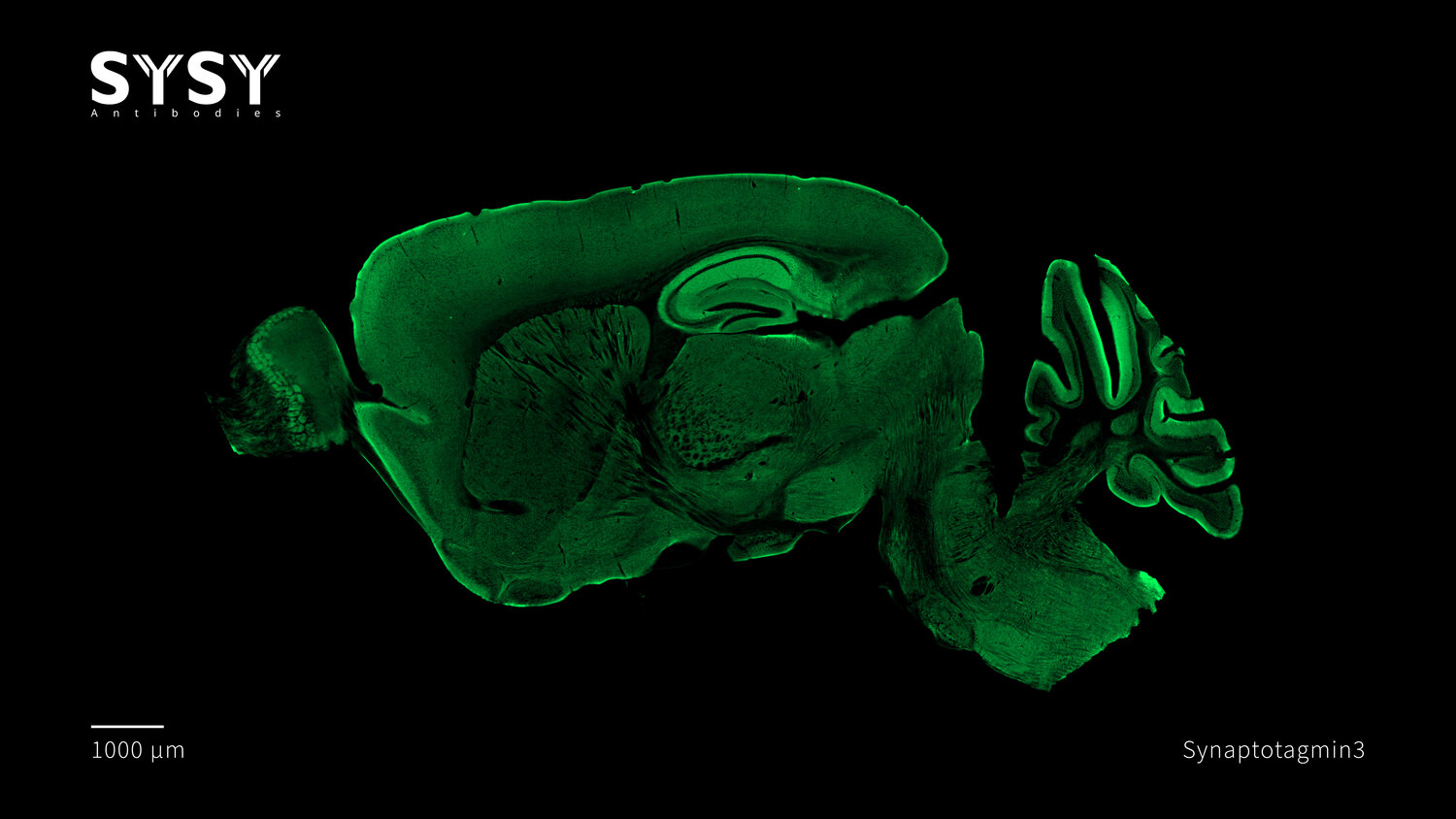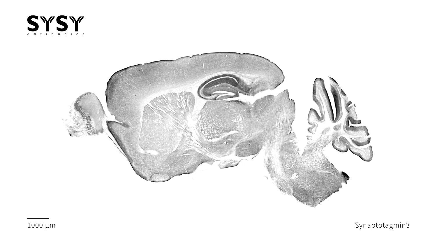 Indirect immunostaining of a formaldehyde fixed sagittal mouse brain section with rabbit anti-Synaptotagmin3 antibody (cat. no. 105 133, dilution 1 : 500).