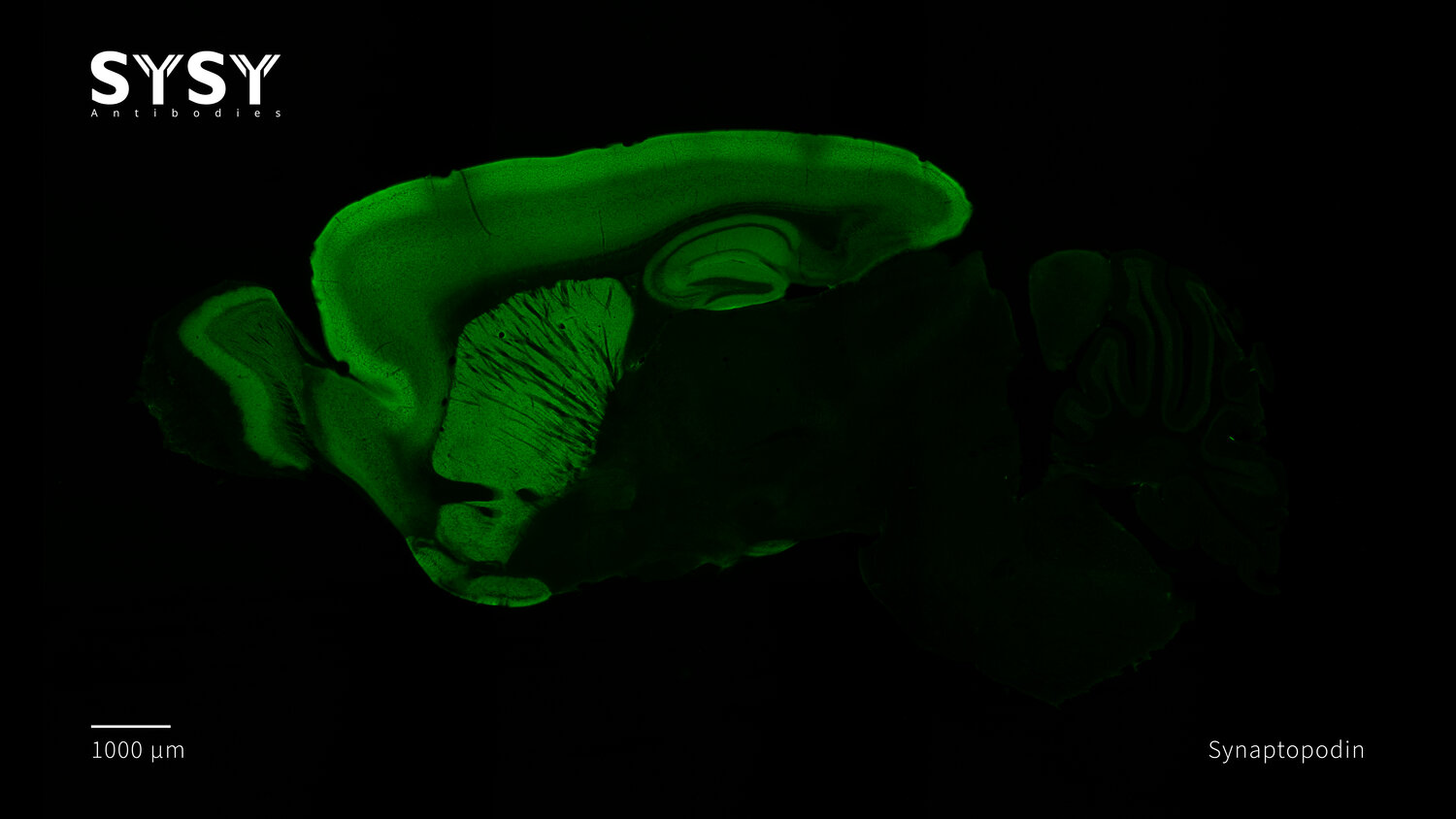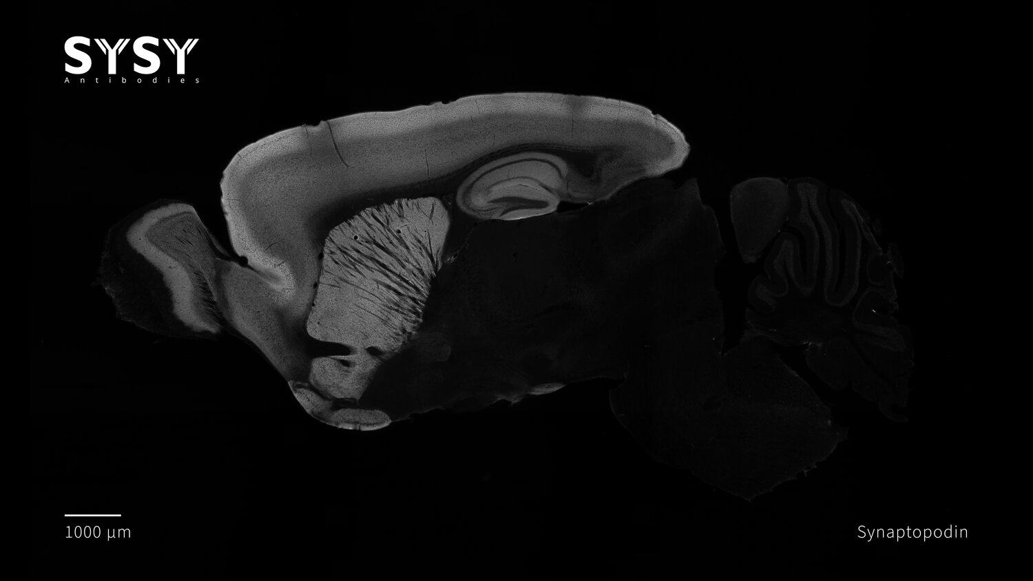 Indirect immunostaining of a formaldehyde fixed sagittal mouse brain section with mouse anti-Synaptopodin antibody (cat. no. 163 011, dilution 1 : 500).
