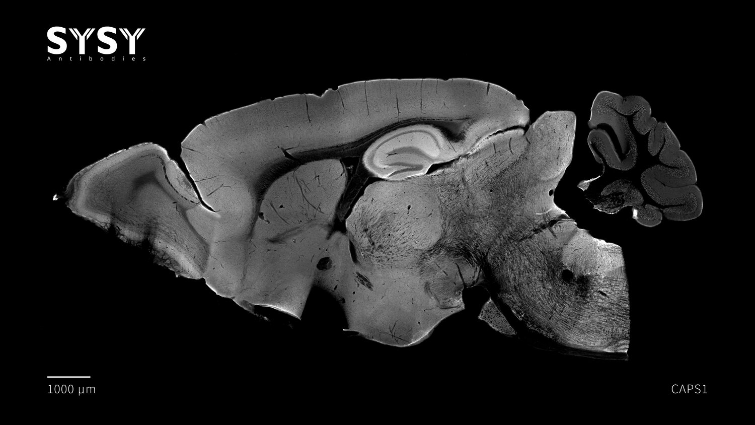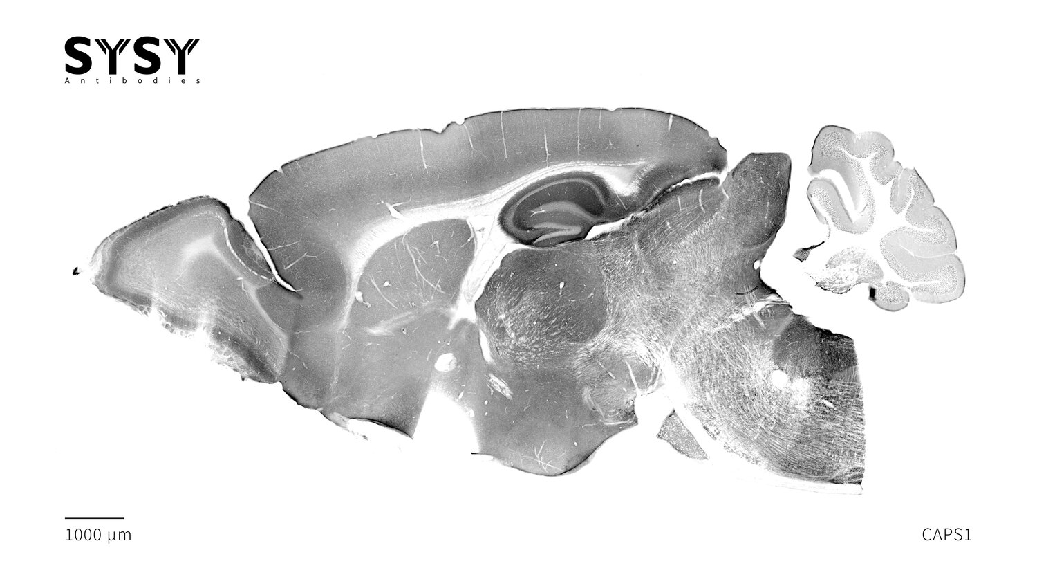 Indirect immunostaining of a formaldehyde fixed sagittal mouse brain section with rabbit anti-CAPS1 antibody (cat. no. 262 003, dilution 1 : 500).