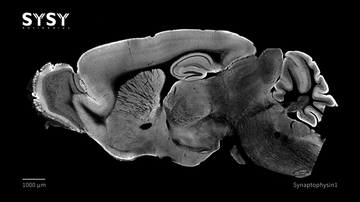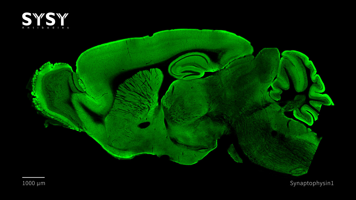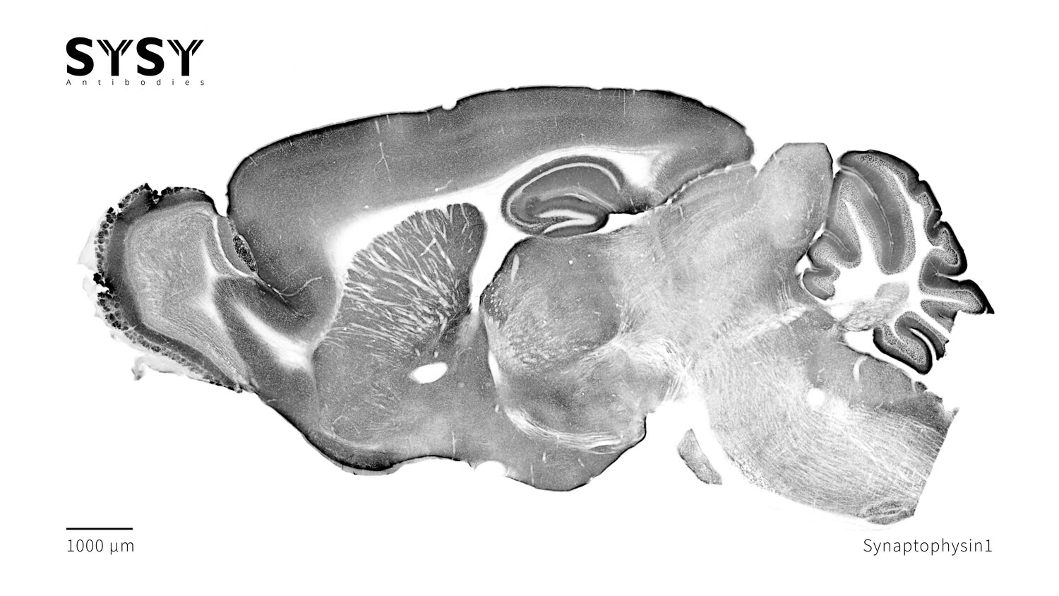 Indirect immunostaining of a formaldehyde fixed sagittal mouse brain section with guinea pig anti-Synaptophysin1 antibody (cat. no. 101 308, dilution 1 : 500).