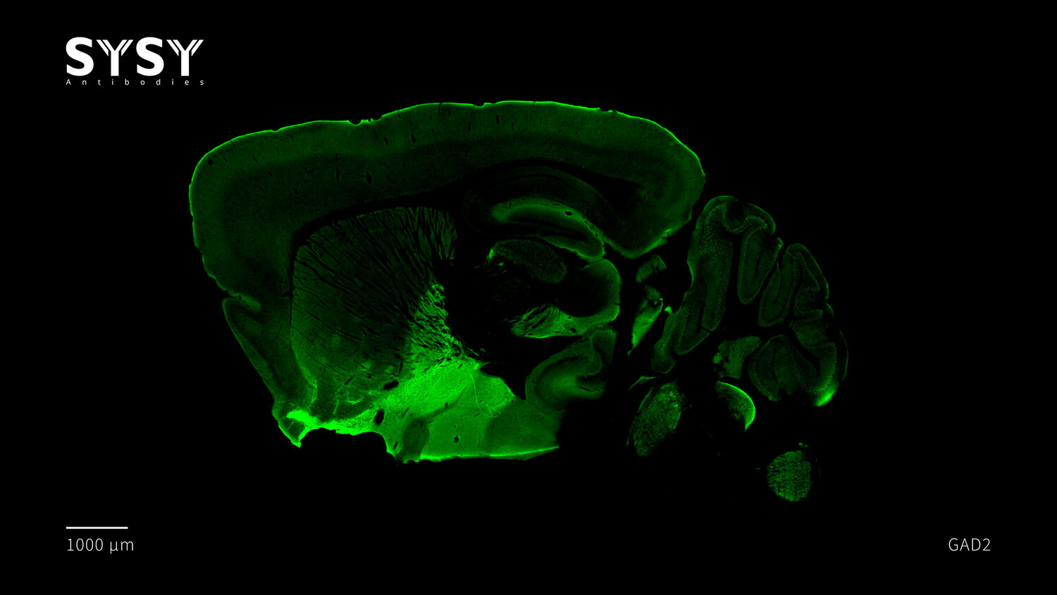 Indirect immunostaining of a formaldehyde fixed sagittal mouse brain section with chicken anti-GAD2 antibody (cat. no. 198 109, dilution 1 : 5000).