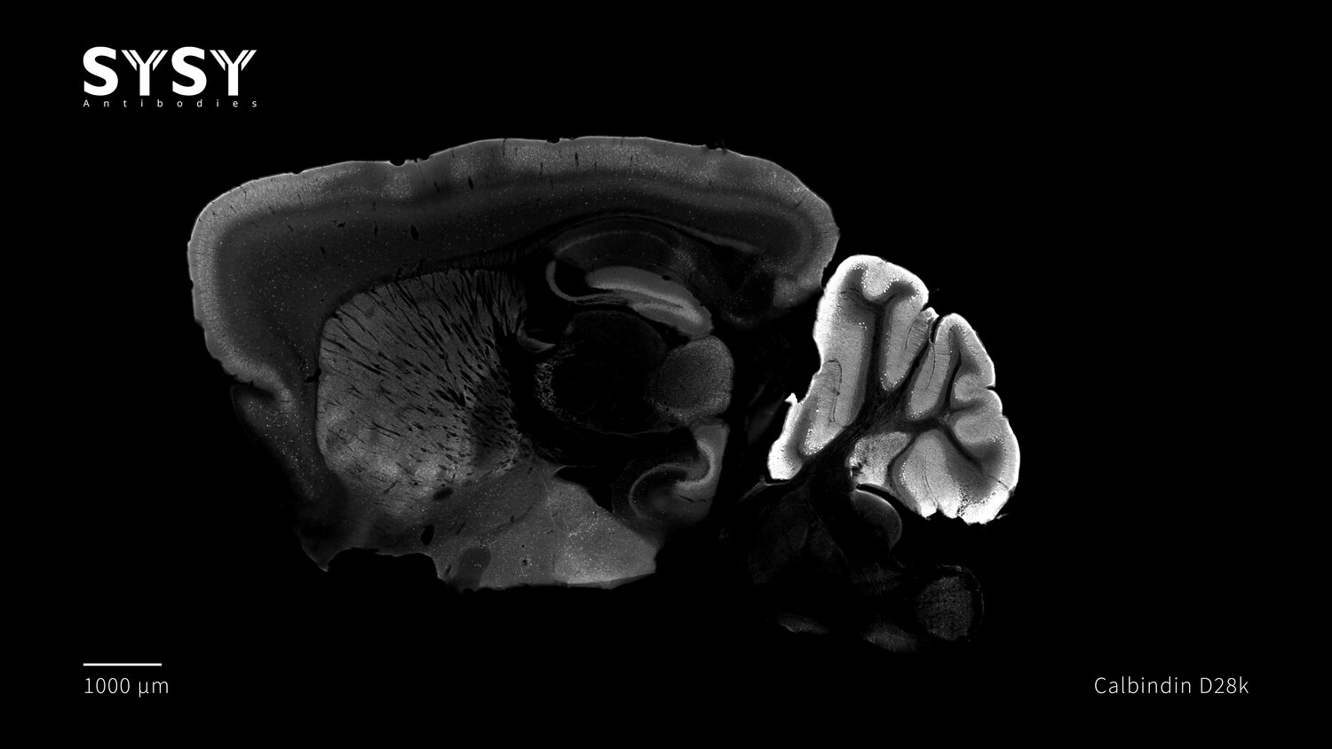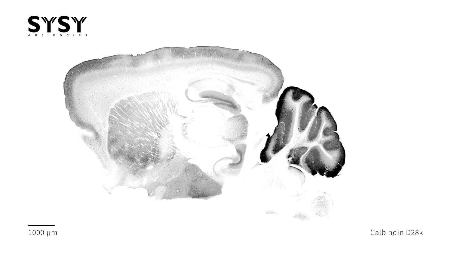 Indirect immunostaining of a formaldehyde fixed sagittal mouse brain section with rabbit anti-Calbindin D28k antibody (cat. no. 214 008, dilution 1 : 500).