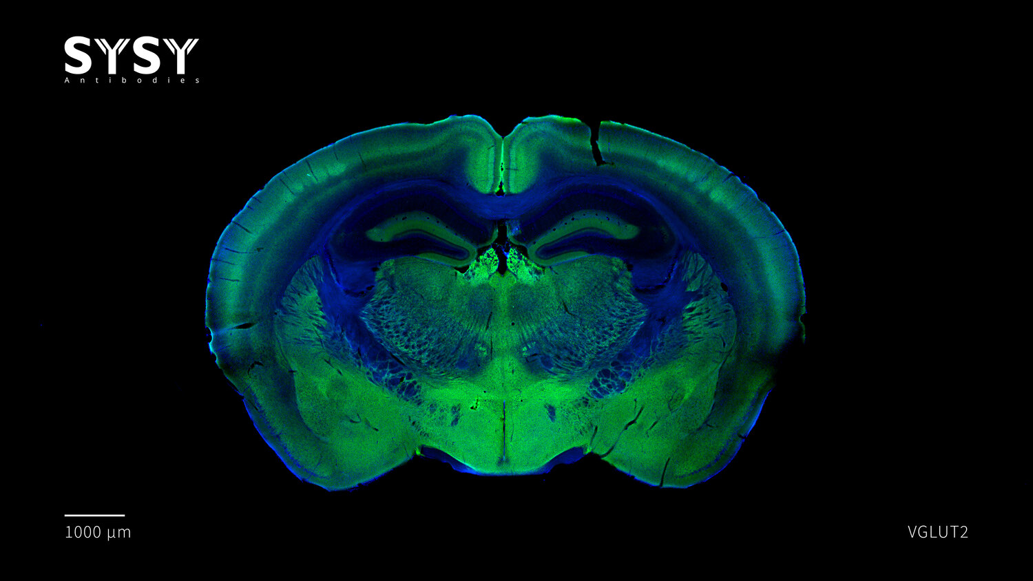Indirect immunostaining of a formaldehyde fixed coronal mouse brain section with rabbit anti-VGLUT2 antibody (cat. no. 135 408, dilution 1 : 500).