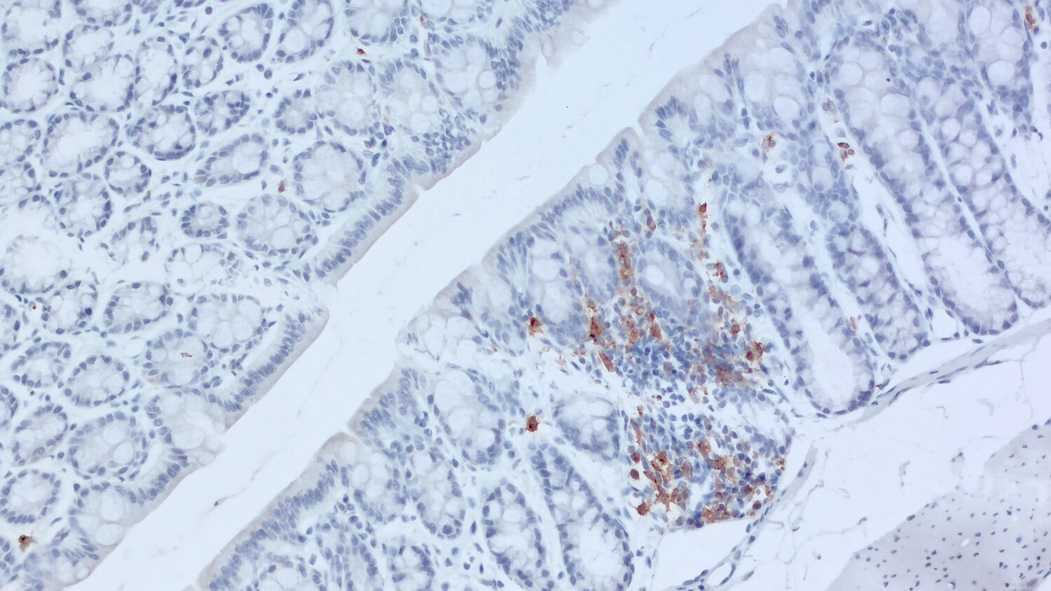 Figure 2: Immunohistochemical staining of murine formalin-fixed paraffin embedded mouse colon section with rabbit anti-CD11c (HS-375 003, 1:100, DAB). Nuclei were counterstained with hematoxylin (blue).