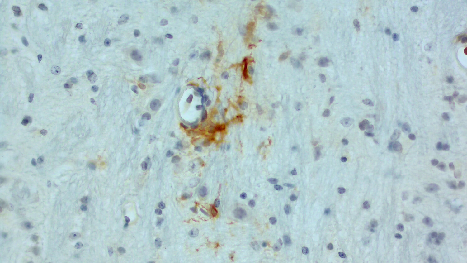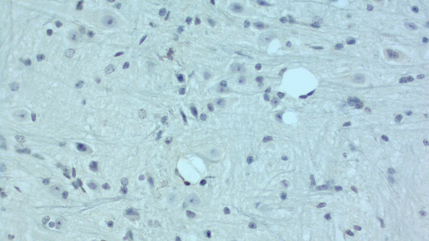 Figure 5: Immunohistochemical staining of formalin fixed paraffin embedded (FFPE) mouse brain sections of A a naïve control mouse and B a mouse with systemic T. gondii infection using guinea pig anti-CD11c (HS-375 004, 1:1000, DAB). Nuclei were counterstained with hematoxylin (blue).