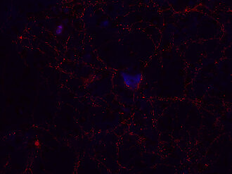 Albumin was added for stabilization. For reconstitution add 50 µl H2O to get a 1mg/ml solution in PBS. Either add 1:1 (v/v) glycerol, then aliquot and store at -20°C until use, or store aliquots at -80°C without additives. Reconstitute immediately upon receipt! Avoid bright light when working with the antibody to minimize photo bleeching of the fluorescent dye. |