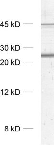 50 µg specific antibody, lyophilized. Affinity purified with the immunogen. Albumin was added for stabilization. For reconstitution add 50 µl H2O to get a 1mg/ml solution in PBS. Then aliquot and store at -20°C to -80°C until use. Antibodies should be stored at +4°C when still lyophilized. Do not freeze! |