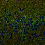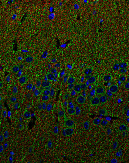 Five EAATs with differential expression patterns have been described so far: EAAT1, also referred to as GLAST and SLC1A3, has neuroprotective potential following ischemia and occurs in reactive astrocytes and activated microglia. EAAT2 (GLT-1, SLC1A2) is the most abundant isoform and is primarily expressed in astrocytes. Both variants show high levels in brain and retina. EAAT3 / SLC1A1, EAAT4 / SLC1A6 and EAAT5 / SLC1A7 are expressed in neurons (2). EAAT4 shows weak expression in the forebrain and high levels in the cerebellum, where it mainly locates to Purkinje cells (3). EAAT5 primarily occurs in the retina, where it locates very close to glutamate release sites. In K.O. mice flicker resolution is considerably compromised (4). Recent findings suggest that EAAT5 is an abundant isoform, expressed also in non-neuronal peripheral tissues (5).