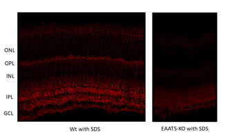 Five EAATs with differential expression patterns have been described so far: EAAT1, also referred to as GLAST and SLC1A3, has neuroprotective potential following ischemia and occurs in reactive astrocytes and activated microglia. EAAT2 (GLT-1, SLC1A2) is the most abundant isoform and is primarily expressed in astrocytes. Both variants show high levels in brain and retina. EAAT3 / SLC1A1, EAAT4 / SLC1A6 and EAAT5 / SLC1A7 are expressed in neurons (2). EAAT4 shows weak expression in the forebrain and high levels in the cerebellum, where it mainly locates to Purkinje cells (3). EAAT5 primarily occurs in the retina, where it locates very close to glutamate release sites. In K.O. mice flicker resolution is considerably compromised (4). Recent findings suggest that EAAT5 is an abundant isoform, expressed also in non-neuronal peripheral tissues (5).