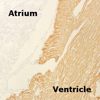These antibodies are useful tools to distinguish between ventricle and atrium specific cardiomyocytes.