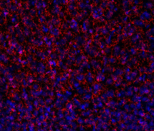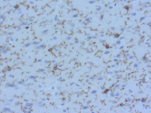 Microglia are resident myeloid cells of the central nervous system (CNS). They are ontogenetically and functionally distinct from monocyte-derived macrophages that infiltrate the CNS under pathological conditions. Transmembrane protein 119 (TMEM119) is a single-pass type I membrane protein that has been identified as a useful, highly selective microglia marker protein.