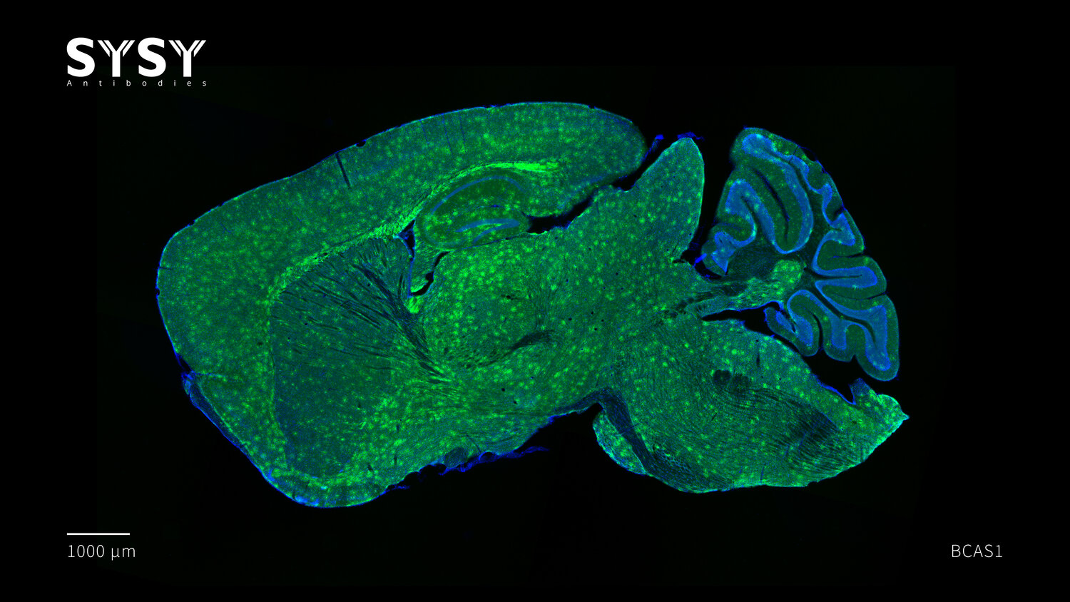 Breast carcinoma-amplified sequence 1 (BCAS1) was originally identified as a potential oncogene amplified in human cancer cell lines (1). It is also highly expressed in brain (2) where it mainly defines an oligodendroglial subpopulation occuring at regions of active myelin formation (3).