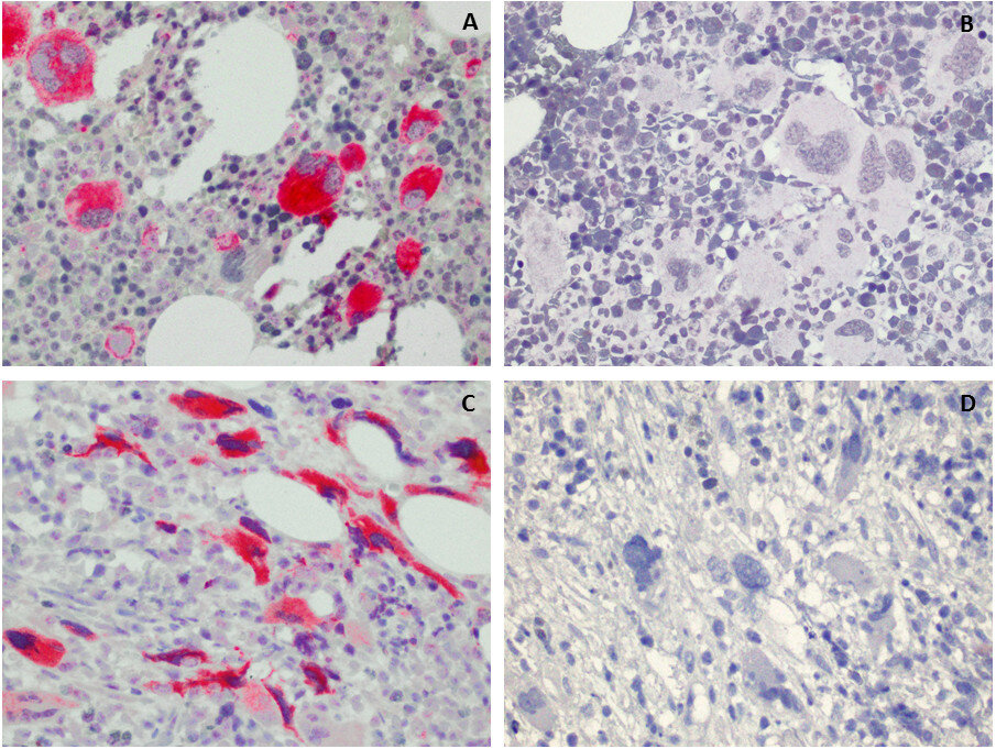It labels the megakaryocytes in myeloproliferative neoplasms (essential thrombocythaemia (ET) and primary myelofibrosis (PMF)) with CALR mutation and enables to distinguish them from polycythemia vera (PV), from CALR mutation negative ET and PMF and from reactive bone marrow.