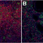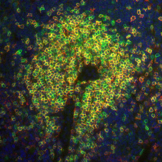 Indirect immunostaining of formalin-fixed paraffin-embedded mouse spleen section with monoclonal rat anti-CD4 (cat. no.: HS-360 117; red) and rabbit polyclonal anti-CD3e (cat. no.: HS-413 103; green) demonstrating the co-localization in CD4 + T-cells (overlay: yellow). Nuclei have been visualized by DAPI staining (blue).