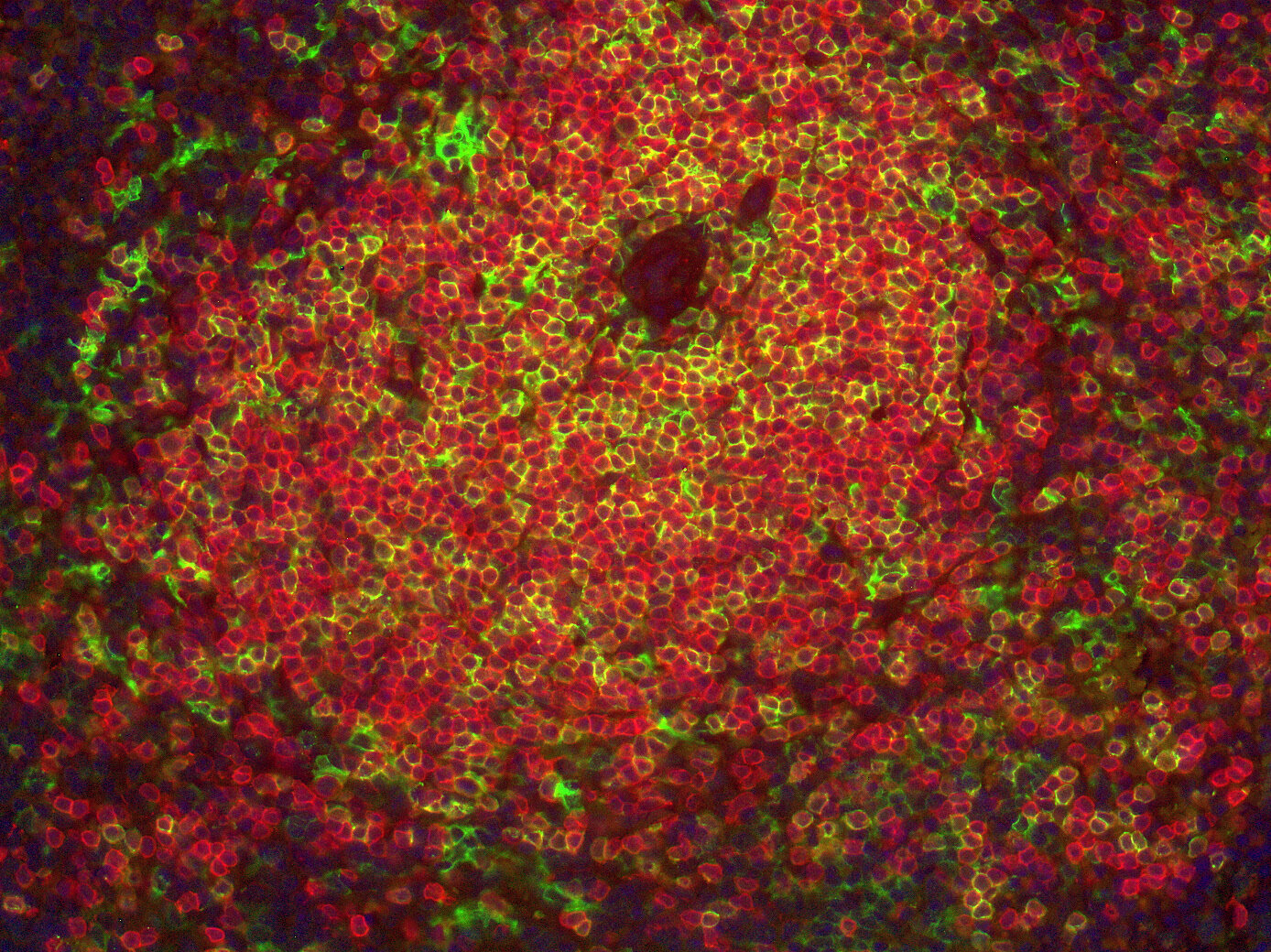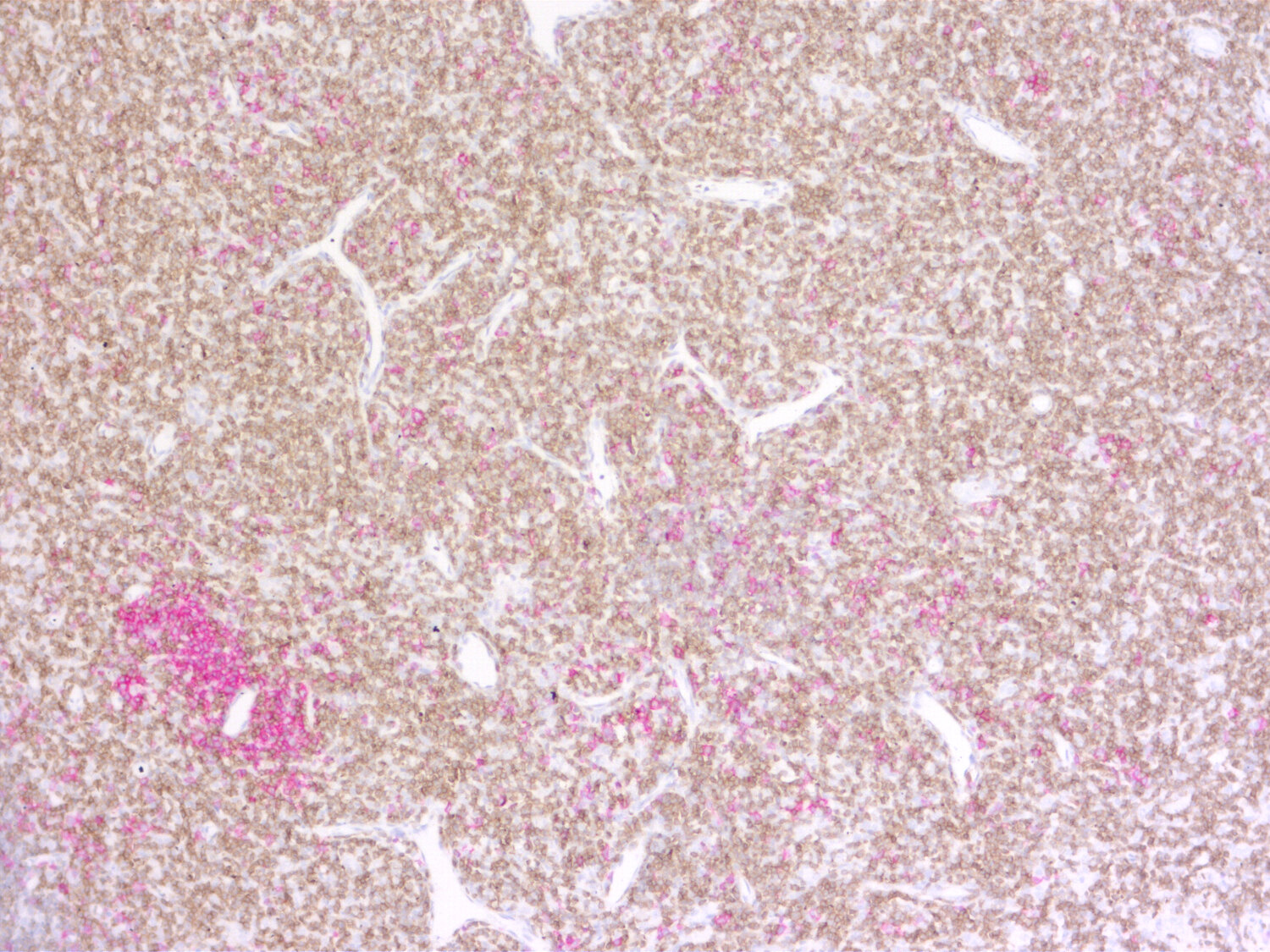 Cluster of differentiation 3 (CD3) is a defining feature of cells belonging to the T cell lineage. It is composed of the four subunits CD3 gamma, CD3 delta, CD3 epsilon (CD3e) and CD3 zeta, that form a multimeric protein complex. This complex associates with the T cell receptor (TCR) and serves as a T cell co-receptor. The CD3 molecules contain immunoreceptor tyrosine-based activation motifs (ITAMs) that serve as the nucleating point for the intracellular signal transduction machinery upon TCR engagement. TCR/CD3 signaling is central to the initiation of antigen-specific T cell responses to pathogens and vaccines, as well as transplanted tissues, tumors, and autoantigens. CD3 is initially expressed in the cytoplasm of pro-thymocytes. During T cell maturation the expression of CD3 migrates to the cell-membrane. The specific appearance at all stages of T cell development make CD3 a useful immunohistochemical marker for T cells in tissue sections. In the clinical setting, CD3 is a relevant marker for the classification of malignant lymphomas and leukemias as the antigen remains present in almost all T-cell lymphomas and leukemias. It can also be used to detect T cells in celiac disease, lymphocytic and collagenous colitis.