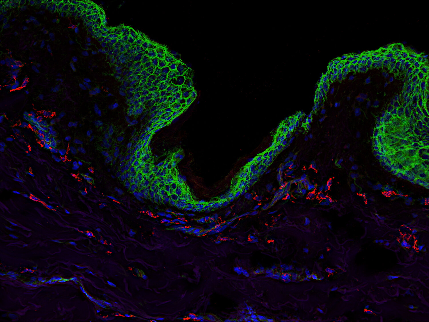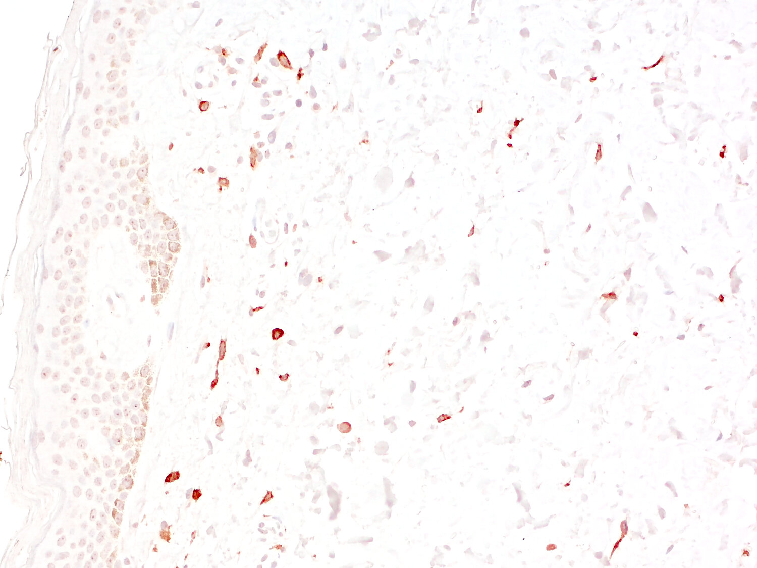 CD163 is a member of the group B scavenger receptor cysteine-rich (SRCR) superfamily expressed on human and murine macrophages. CD163 is also expressed in human monocytes, but not in circulating mouse monocytes (1). CD163 expression is significantly induced by anti-inflammatory stimuli like glucocorticoids and dexamethasone. Inflammatory stimuli like interferon γ and LPS suppress CD163 expression in macrophages (2). In mice, CD163 is mainly expressed by tissue-resident macrophages including Kupffer cells of the liver, red pulp macrophages in the spleen, perivascular macrophages of the CNS (3), and bone-marrow resident macrophages (4), but not by classical bone-marrow derived macrophages (4). In malignant tumors in mice and humans, macrophage CD163-mediated induction of IL-6 promotes tumor development and progression (4). The pool of tumor-associated macrophages (TAMs) is composed of both newly recruited monocyte derived macrophages and resident macrophages (5). CD163-positive tissue-resident macrophages have been shown to play a specific role in the malignant spread of disseminated tumor cells and the development of invasive disease in a mouse model of metastatic ovarian cancer (1). CD163 is considered useful to distinguish CD163-positive resident macrophages from CD163-negative bone-marrow derived macrophages in mice (4).
