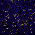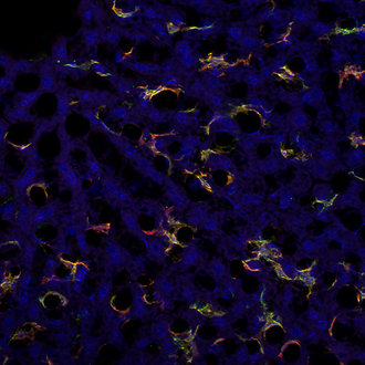 The murine CLEC4F is a hallmark of mouse Kupffer cells (KCs) and its expression distinguishes KCs and recruited macrophages (1). CLEC4F is a C-type lectin participating in the antigen presentation of glycolipid antigens, as well as in the recognition and scavenging of desialylated platelets (2). The human CLEC4F gene does not encode a functional receptor due to a mutation in the splice acceptor site of the final exon preventing the appropriate splicing and a missense mutation disrupts the sugar-binding site (3). CLEC4F colocalises with F4/80. Although F4/80 is constitutively expressed in peripheral and resident macrophages, CLEC4F is inducible in the liver and its expression appears when primitive macrophages migrate into the fetal liver. Moreover, CLEC4F and F4/80 cells in the liver increase after infection (4).