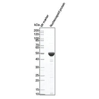 The SARS-CoV-2 nucleocapsid protein is a very basic protein (pI 10.0) that binds to viral RNA, forming ribonucleoprotein complexes that represent the core structure of the virion. The protein tends to assemble into higher oligomeric forms. The amino acid sequence correspondes to the uniprot ID P0DTC9 and was expressed in E. coli with six c-terminal histidines.