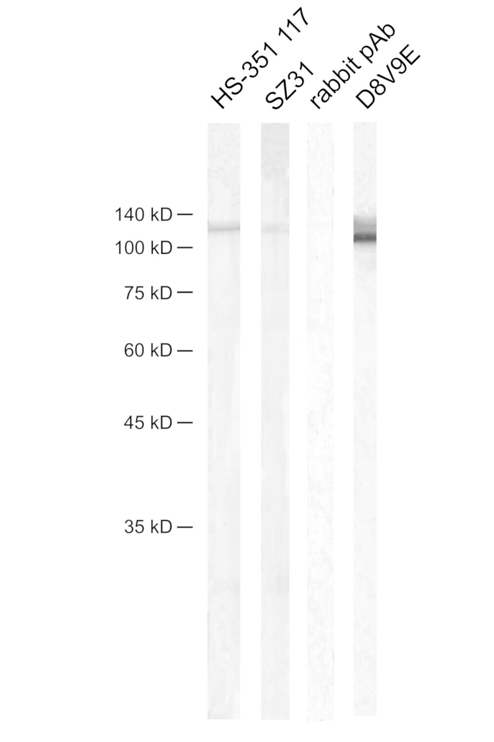 Figure 6: Detection of mouse CD31/PECAM 1 by Western Blot. Western blot shows lysates of mouse lung. The membrane was incubated with lane 1: anti-mouse CD31 rat mAb HS-351 117 (1:1000); lane 2: anti-mouse CD31 rat mAb SZ31 (competitor antibody; 1:10); lane 3: anti-mouse CD31 rb pAb (competitor antibody; 1:50); lane 4: anti-mouse CD31 rabbit mAb D8V9E (competitor antibody; 1:500). A specific band was detected for CD31/PECAM-1 at approximately 130 kDa.