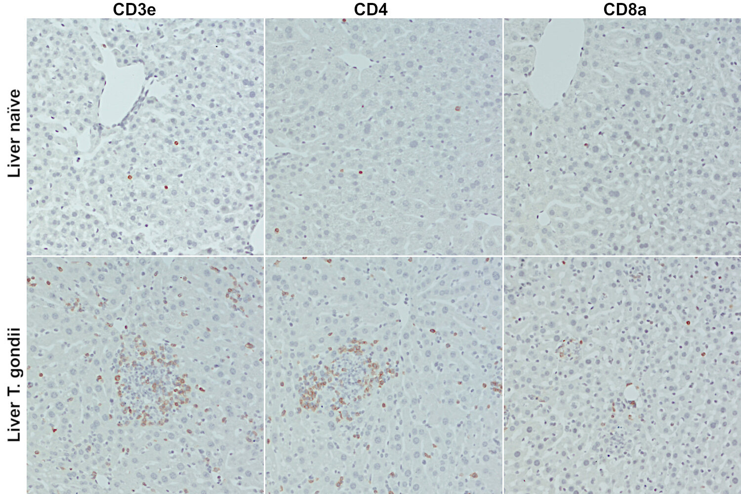 Massive infiltration of CD4+ T helper cells and, to a lesser extent, infiltration of CD8+ cytotoxic T cells into the T. gondii infected mouse liver is visualized by immunohistochemical staining of liver sections with the T cell markers CD3e (T cell lineage marker), CD4 (T helper cells) or CD8a (cytotoxic T cells) (Figure 6).