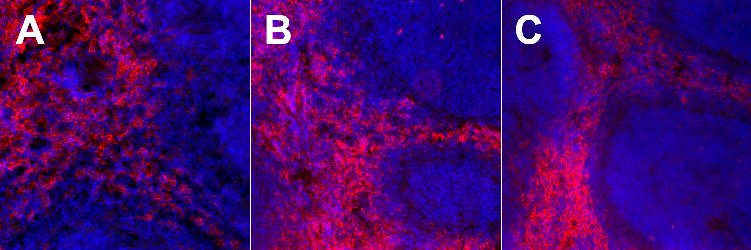 Figure 3: Indirect immunostaining of differently fixed mouse spleen sections with rat anti-F4/80 antibody (cat. HS-397 017, dilution 1:500, red) A: Vibratome section of a mouse spleen fixed in 4% formaldehyde for 24 hours, B: Fresh frozen cryosection, post-fixed for 15 min in 4% formaldehyde, C: Fresh frozen cryosection, post-fixed with cold methanol for 10 minutes.