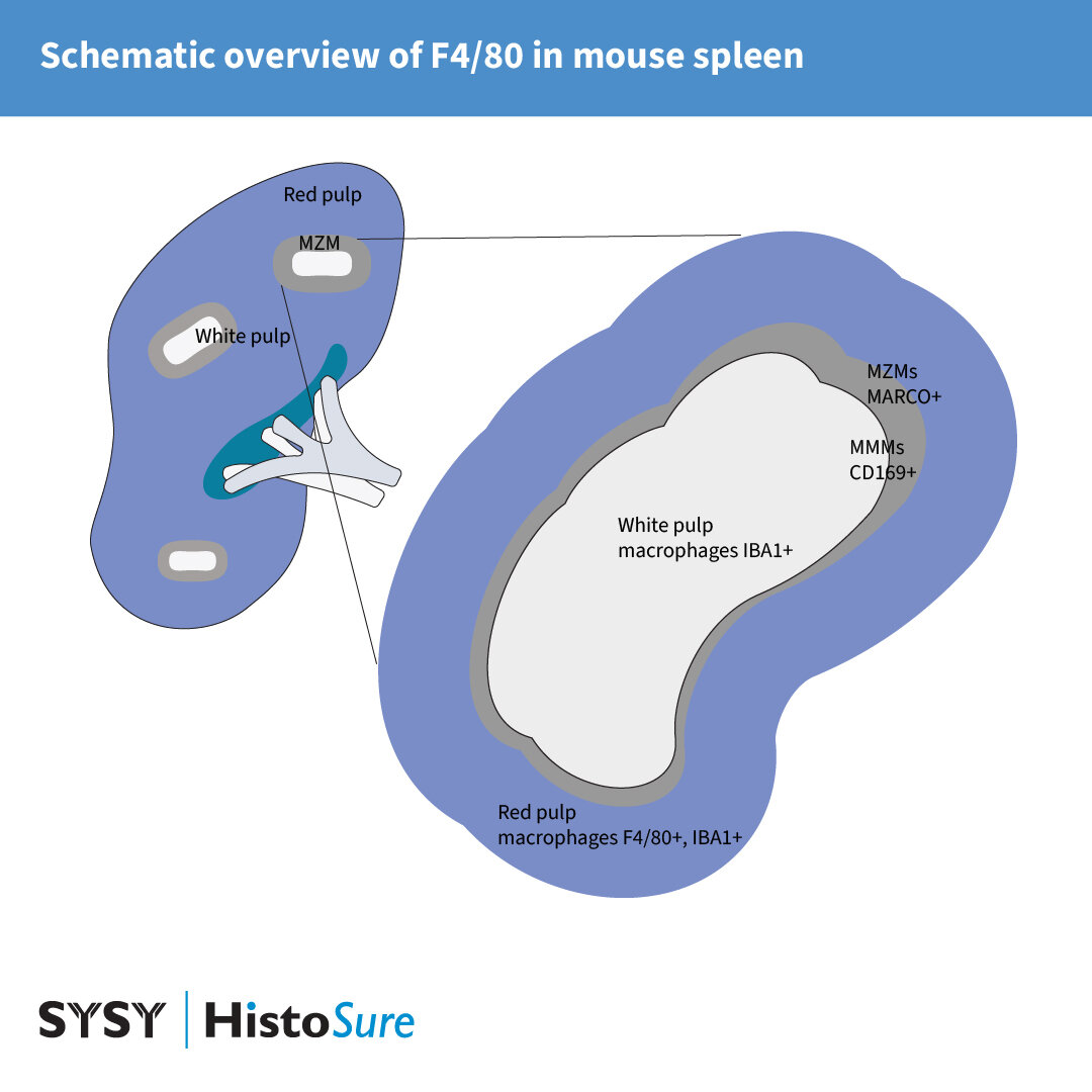 Using F4/80 in multiplex IHC offers several benefits for studying macrophages in tissues, but there are also challenges to consider. Highly specific F4/80 antibodies are needed that bind macrophages, but not closely related hematopoietic cells in complex tissue environments. For compatibility with other markers, it is advantageous if the antibodies work in a variety of tissue-based methods and protocols. Therefore, we investigated the staining properties of SYSY|HistoSure F4/80 antibodies in different IHC protocols in formalin-fixed tissue (IHC-P), as well as using different post-fixation methods in fresh frozen tissue.