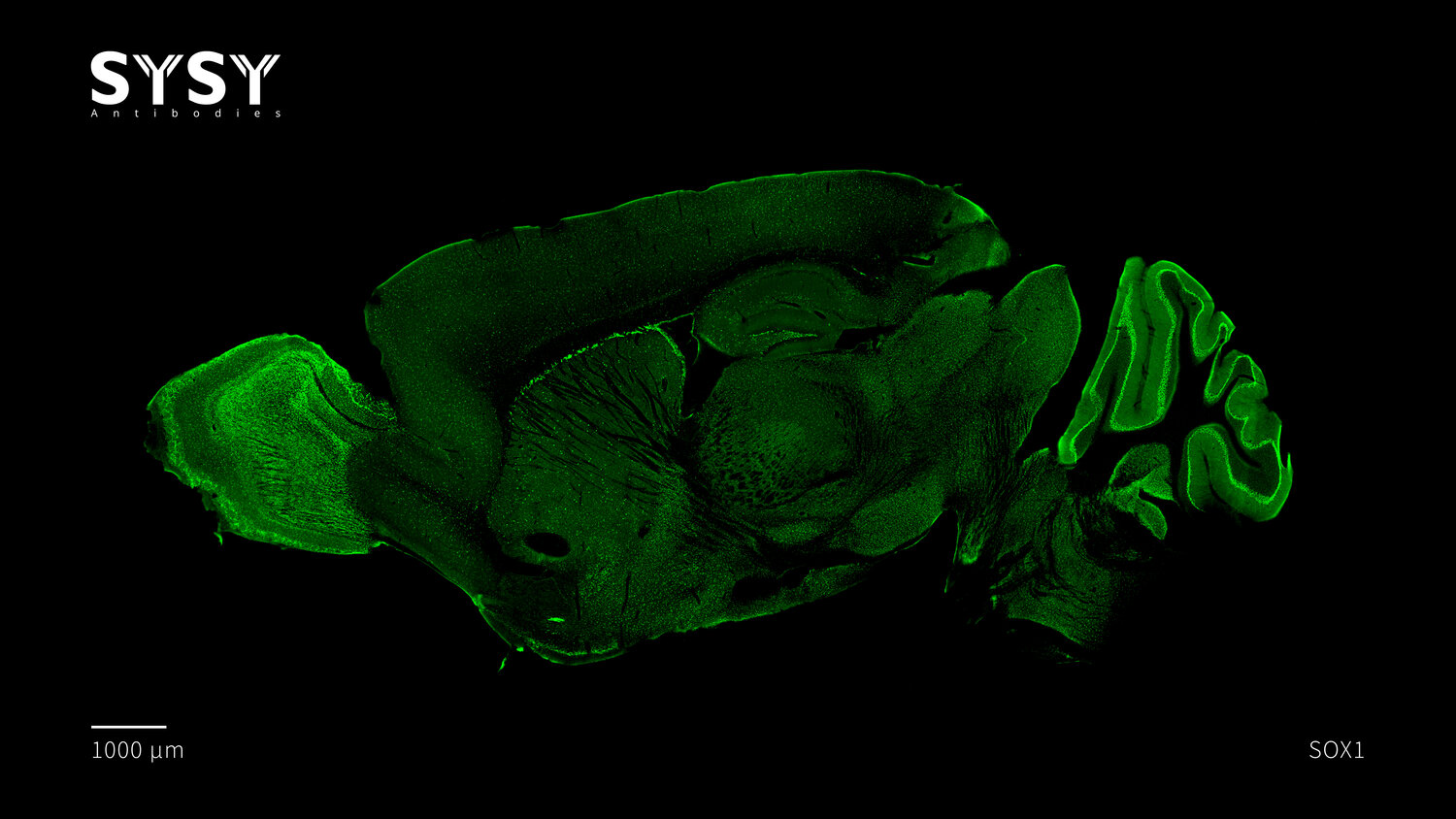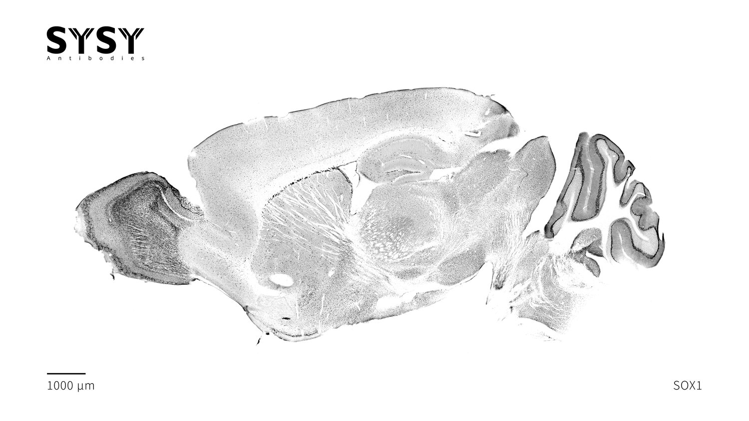 Indirect immunostaining of formaldehyde fixed sagittal mouse brain section with guinea pig anti-SOX1 (cat. no. 347 104, dilution 1 : 2000).
