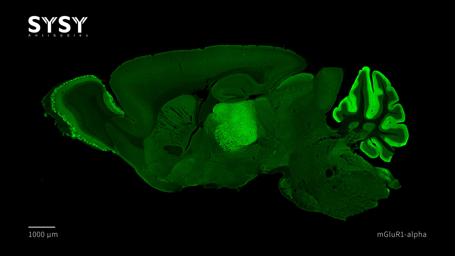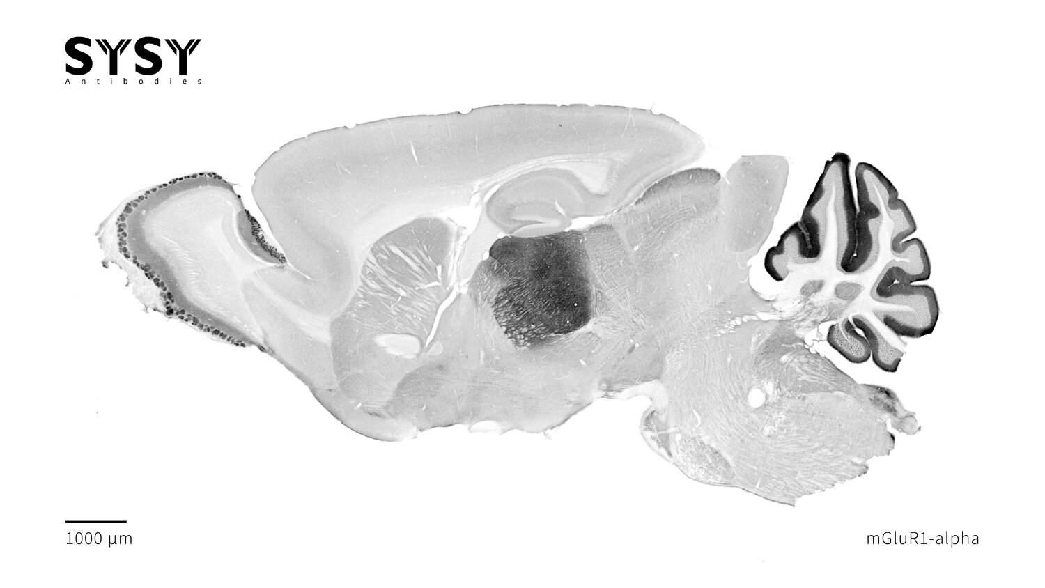 Indirect immunostaining of formaldehyde fixed sagittal mouse brain section with rabbit anti-mGluR1-alpha (cat. no. 191 003, dilution 1 : 500).