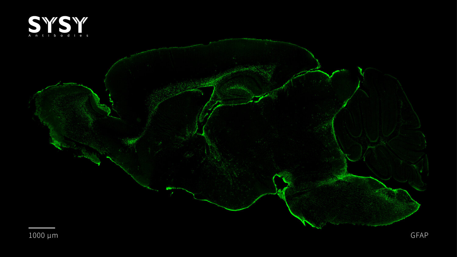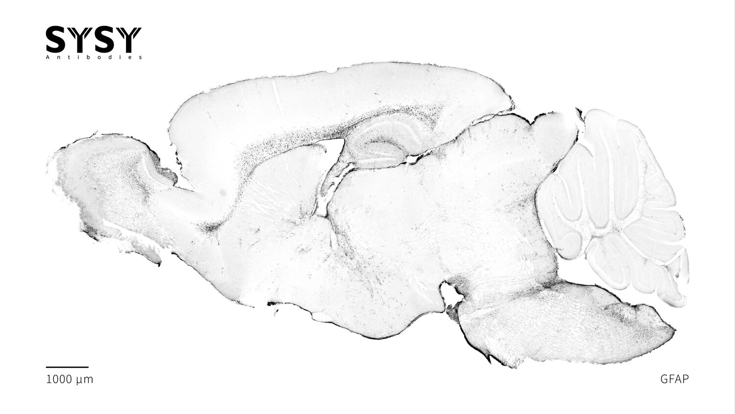 Indirect immunostaining of formaldehyde fixed sagittal mouse brain section with rabbit anti-GFAP (cat. no. 173 008, dilution 1 : 2000).