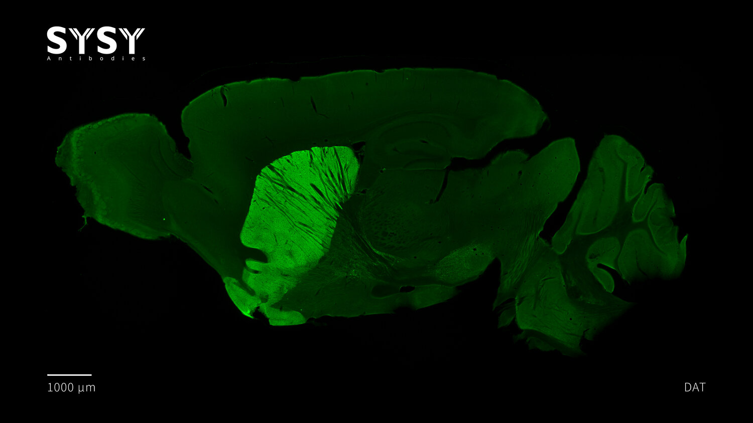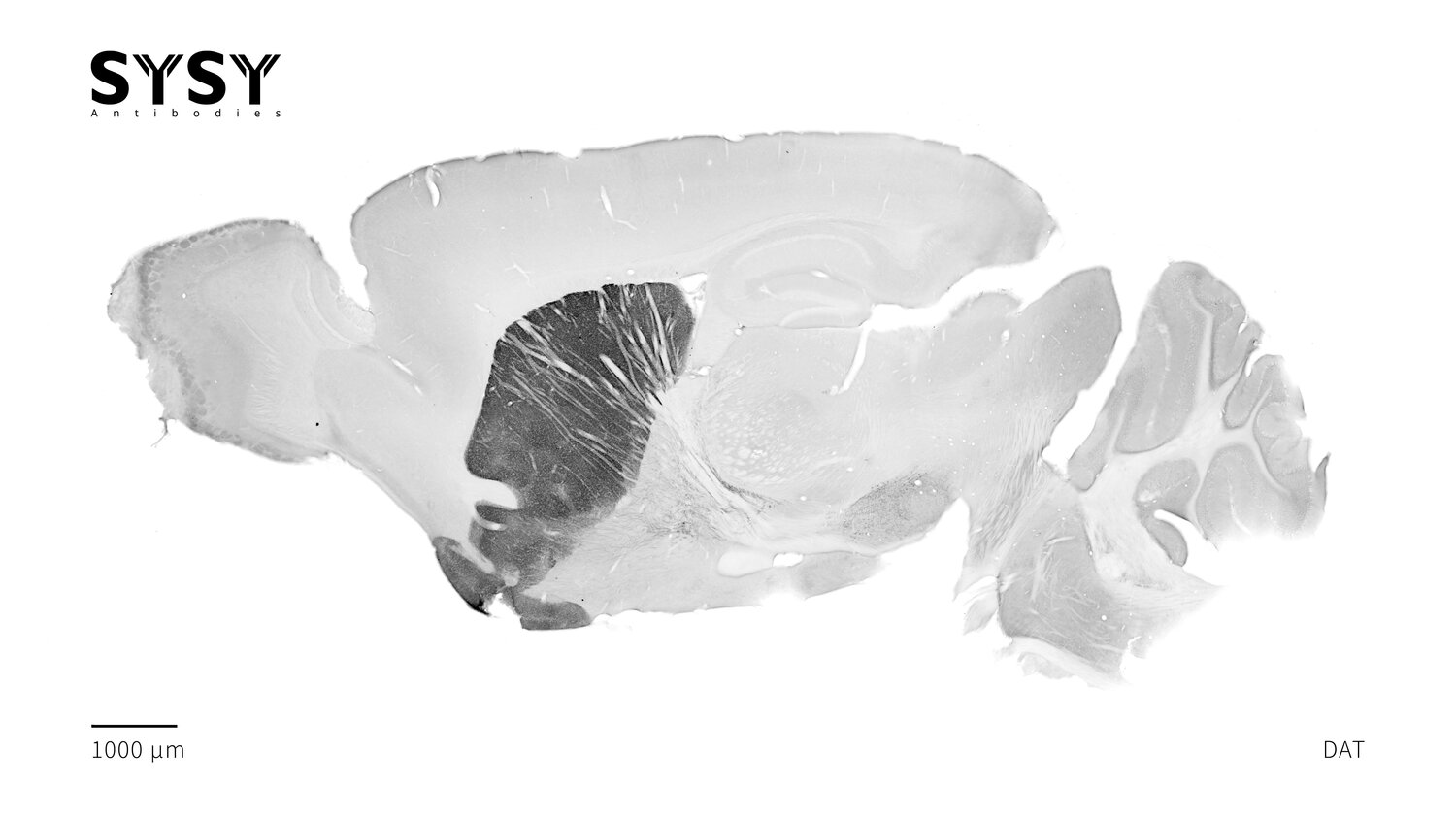 Indirect immunostaining of a formaldehyde fixed sagittal mouse brain section with mouse anti-DAT antibody (cat. no. 284 011, dilution 1 : 500).