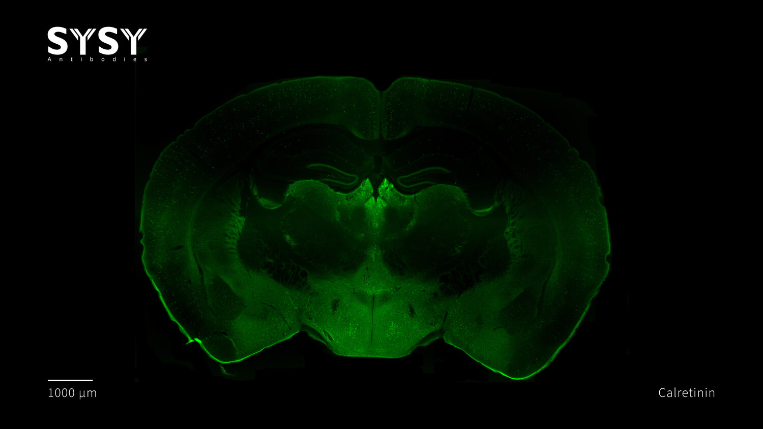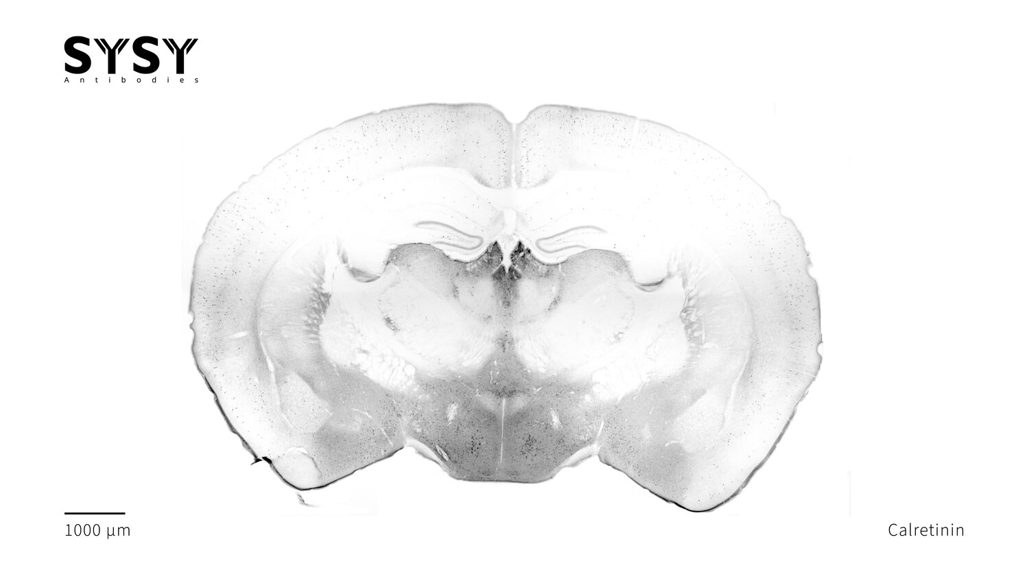Indirect immunostaining of a formaldehyde fixed coronal mouse brain section with mouse anti-Calretinin antibody (cat. no. 214 111, dilution 1 : 500).