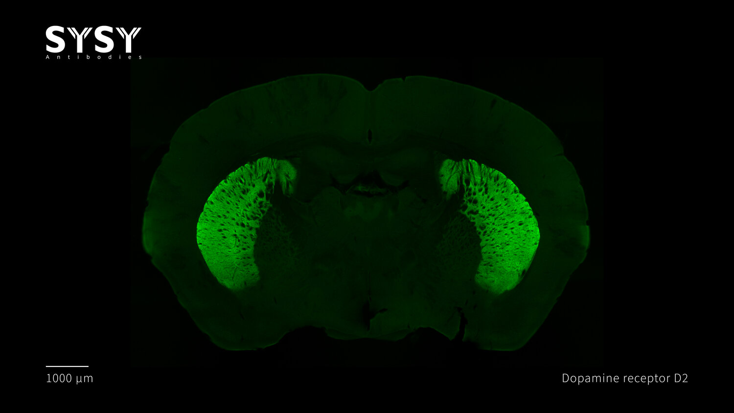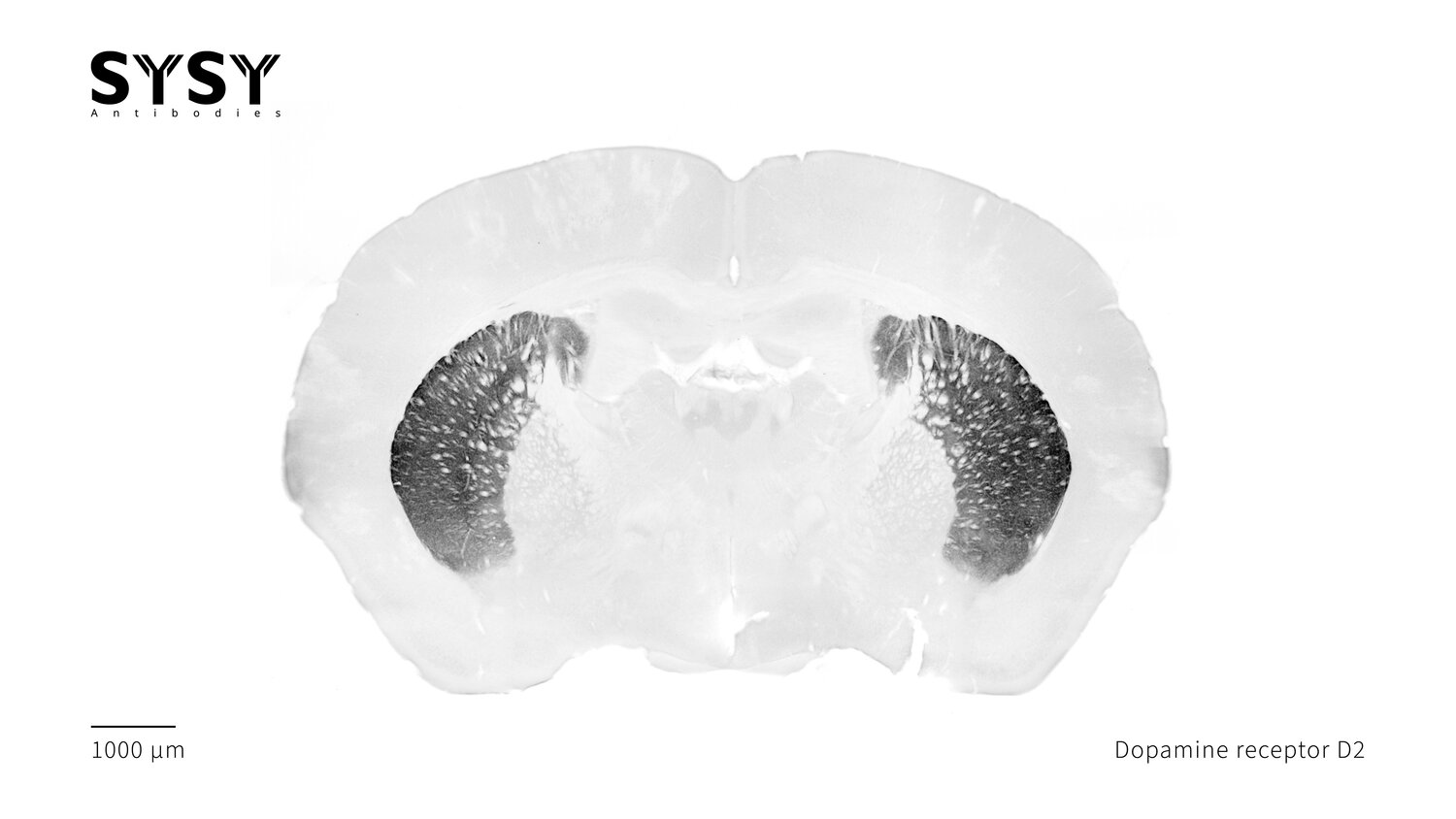 Indirect immunostaining of a formaldehyde fixed coronal mouse brain section with rabbit anti-Dopamine receptor D2 antibody (cat. no. 376 203, dilution 1 : 500).