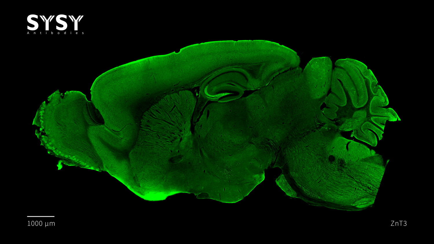 Indirect immunostaining of a formaldehyde fixed sagittal mouse brain section with mouse anti-ZnT3 antibody (cat. no. 197 011, dilution 1 : 500).