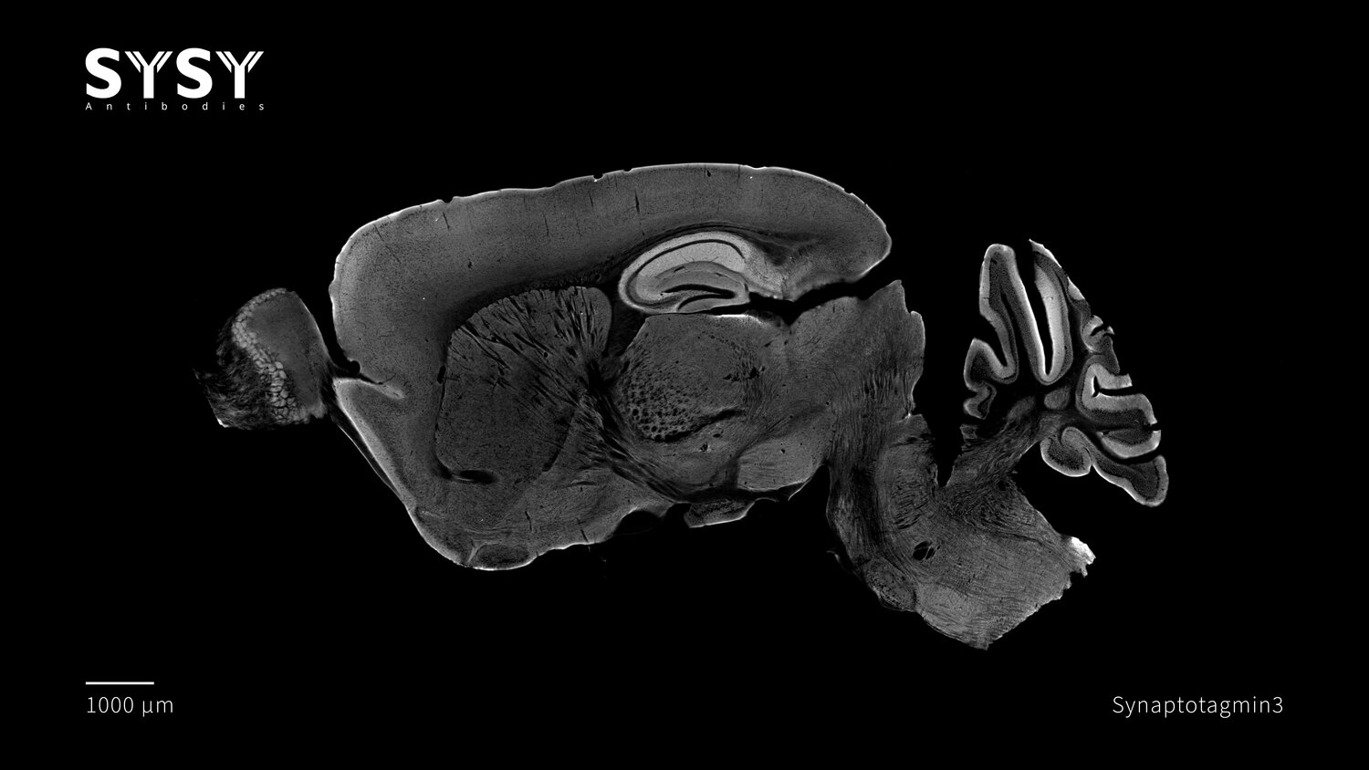 Indirect immunostaining of a formaldehyde fixed sagittal mouse brain section with rabbit anti-Synaptotagmin3 antibody (cat. no. 105 133, dilution 1 : 500).