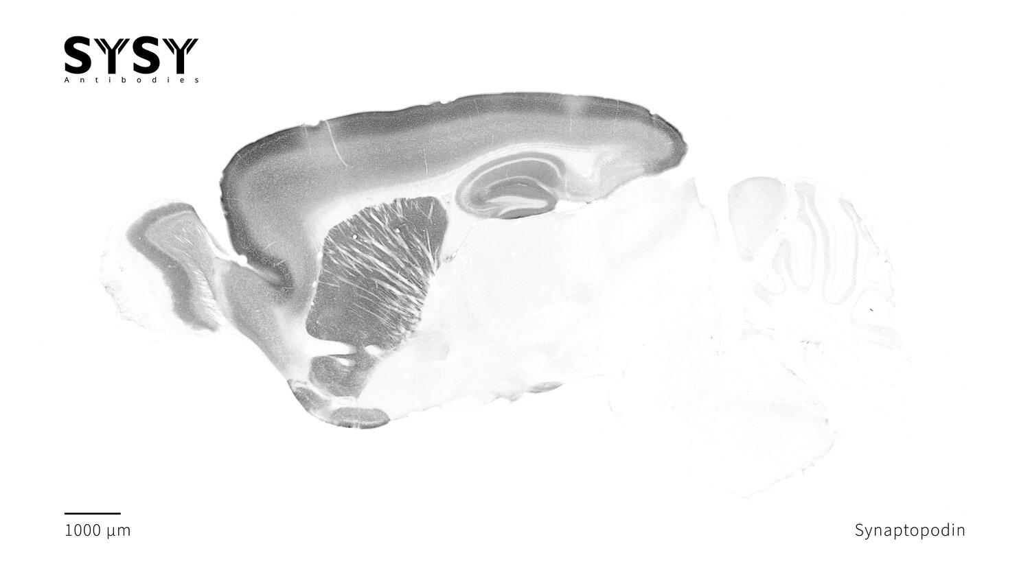 Indirect immunostaining of a formaldehyde fixed sagittal mouse brain section with mouse anti-Synaptopodin antibody (cat. no. 163 011, dilution 1 : 500).