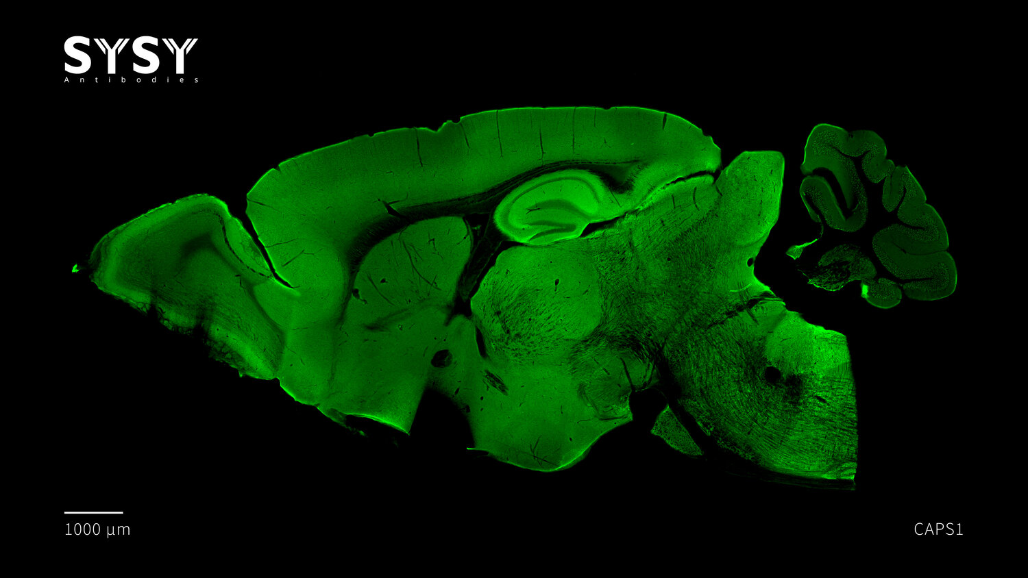 Indirect immunostaining of a formaldehyde fixed sagittal mouse brain section with rabbit anti-CAPS1 antibody (cat. no. 262 003, dilution 1 : 500).