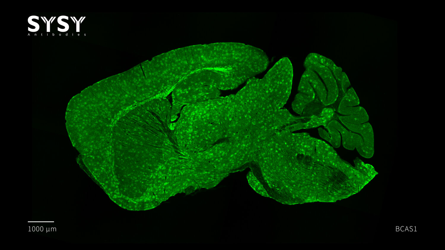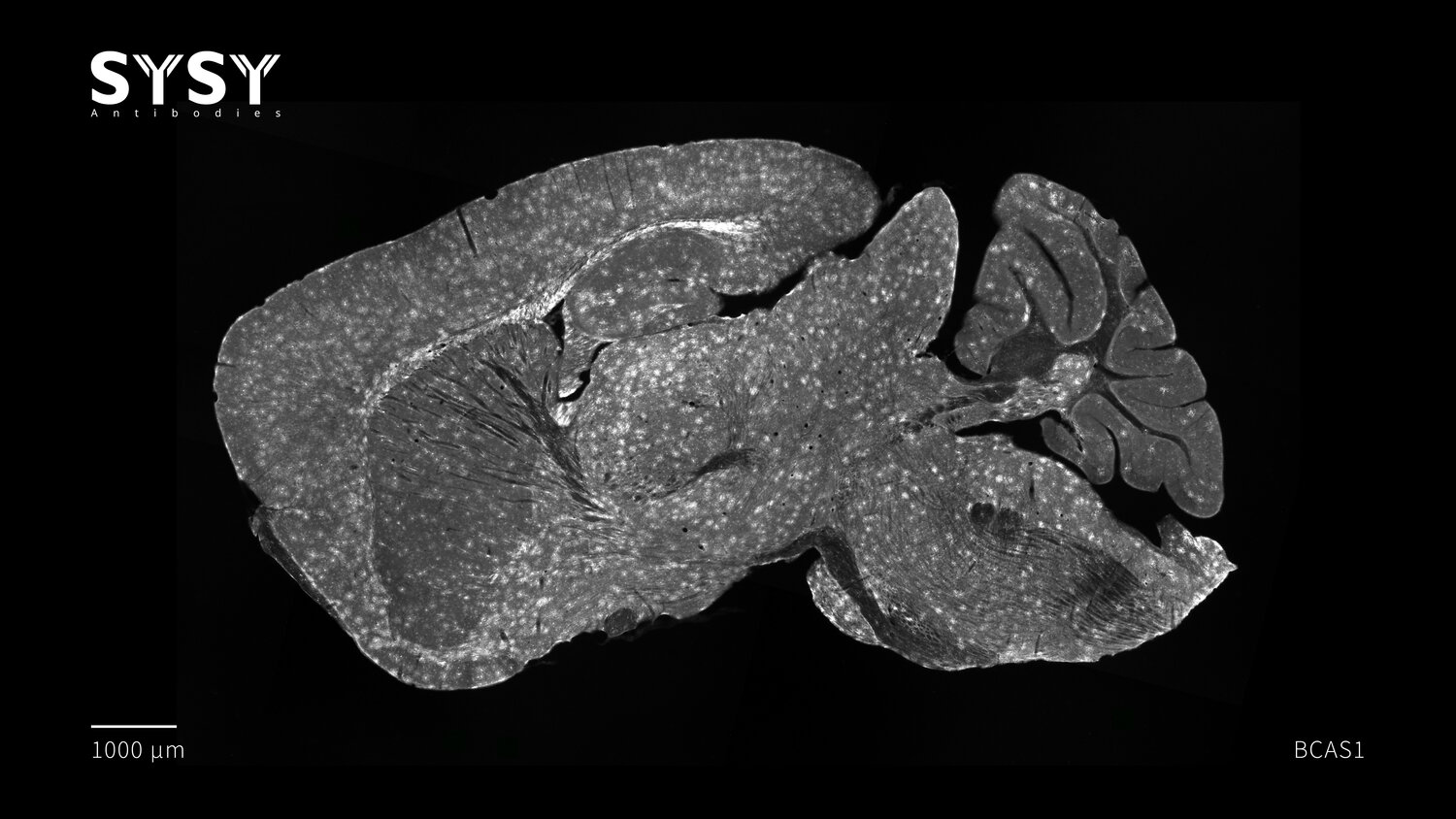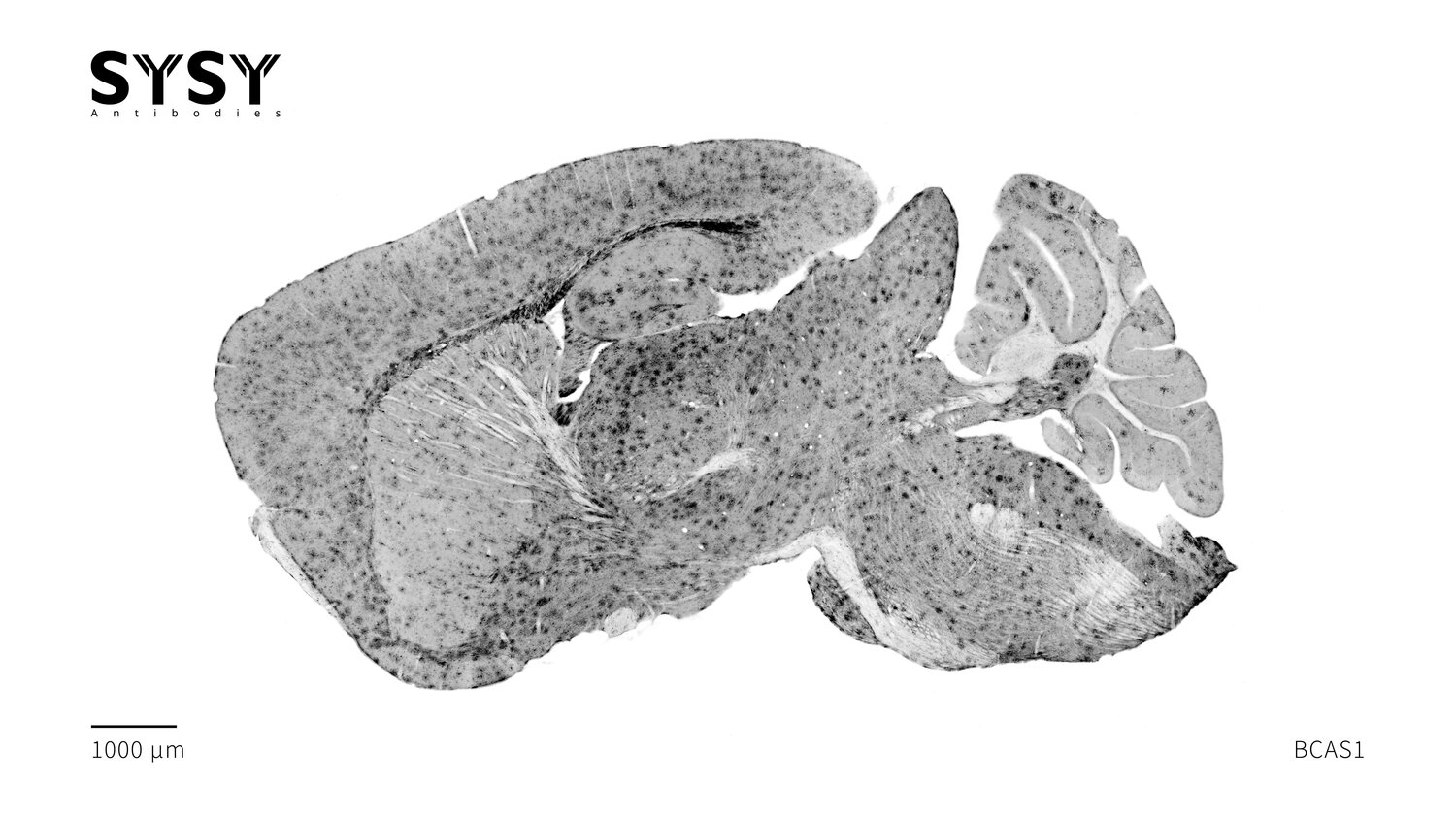 Indirect immunostaining of a formaldehyde fixed sagittal mouse brain section with rabbit anti-BCAS1 antibody (cat. no. 445 008, dilution 1 : 1000).