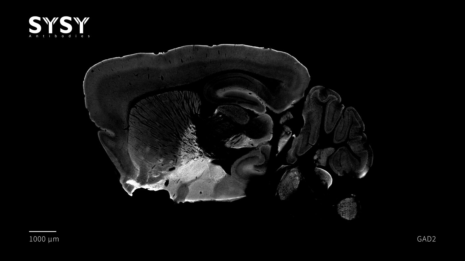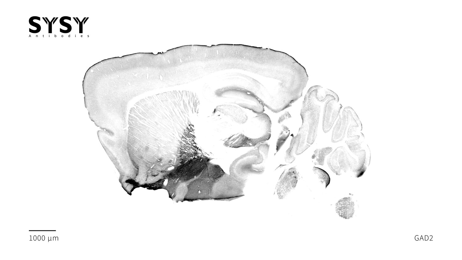 Indirect immunostaining of a formaldehyde fixed sagittal mouse brain section with chicken anti-GAD2 antibody (cat. no. 198 109, dilution 1 : 5000).