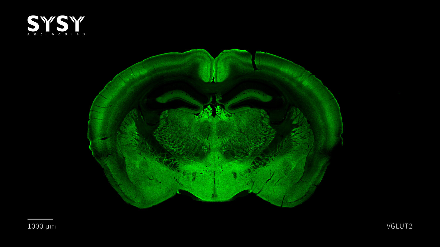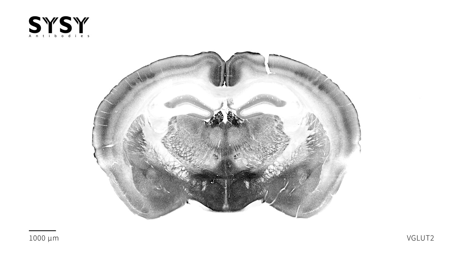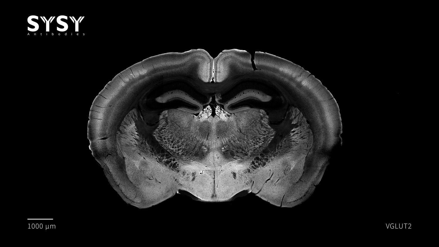 Indirect immunostaining of a formaldehyde fixed coronal mouse brain section with rabbit anti-VGLUT2 antibody (cat. no. 135 408, dilution 1 : 500).