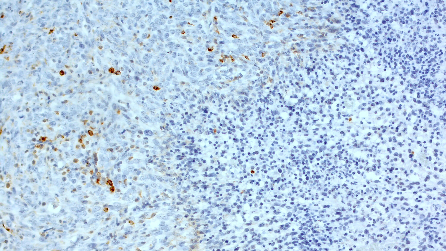 Figure 1: Immunohistochemical staining of murine formalin-fixed paraffin embedded mouse spleen section with Guinea-pig anti-CD11c (HS-375 004, 1:1000, DAB). Nuclei were counterstained with hematoxylin (blue).