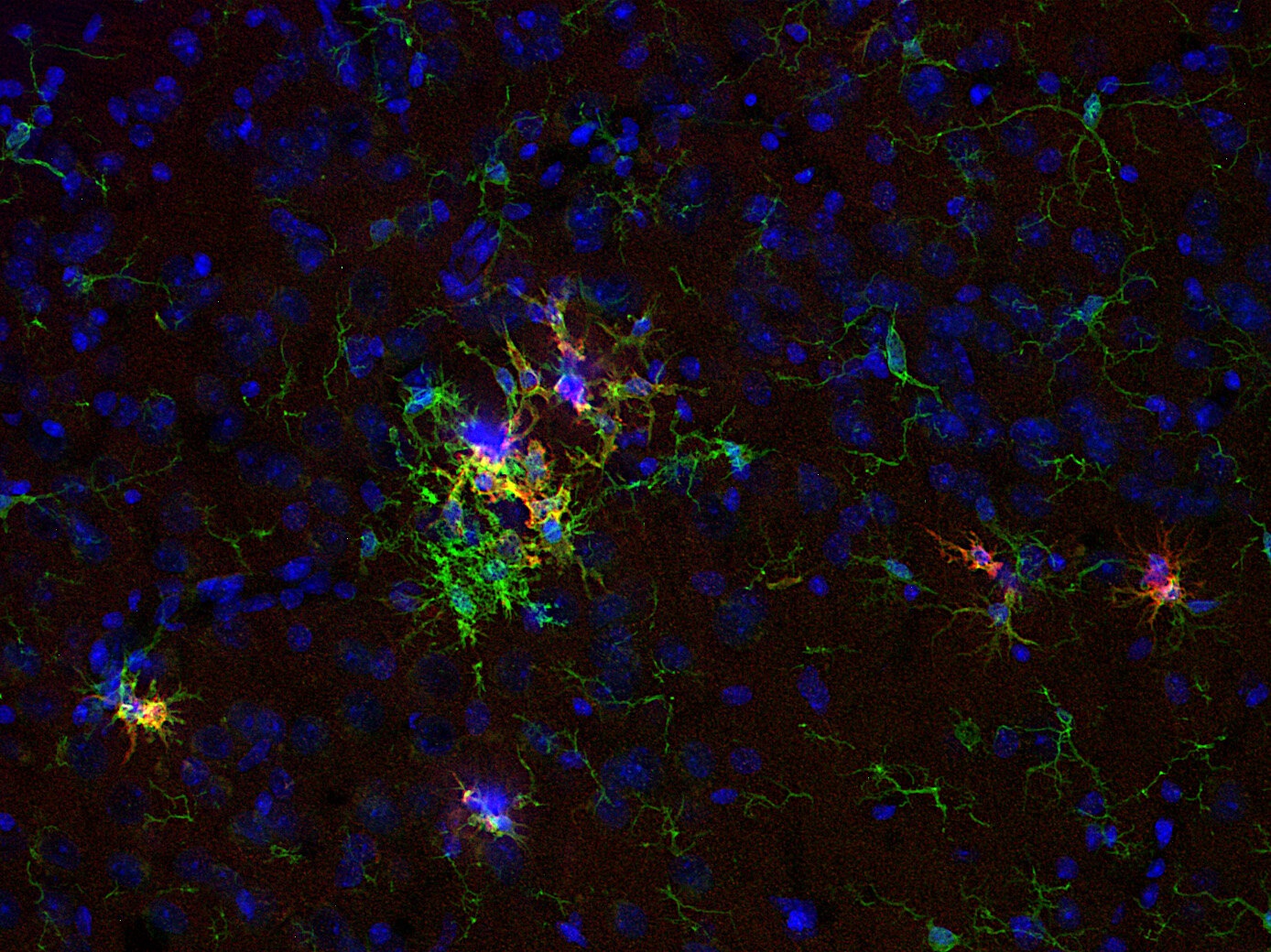 Microglia are the key immune effector cells of the central nervous system (CNS) and play an essential role in brain infection but also in maintenance of the CNS. Activation of Microglia is a common feature in many neurological disorders including inflammatory, demyelinating, and degenerative diseases, as well as glioma and injury. CD11c expression is a marker of microglia activation and the presence of CD11c+ microglia around Aβ plaques in Alzheimer’s disease (AD) has been shown in several studies (reviewed in Benmamar-Badel et al., 2020). Microglial CD11c expression near plaques is also detected in the APP/PS1 AD models as confirmed through co-staining with the microglia marker IBA-1 (figure 4).