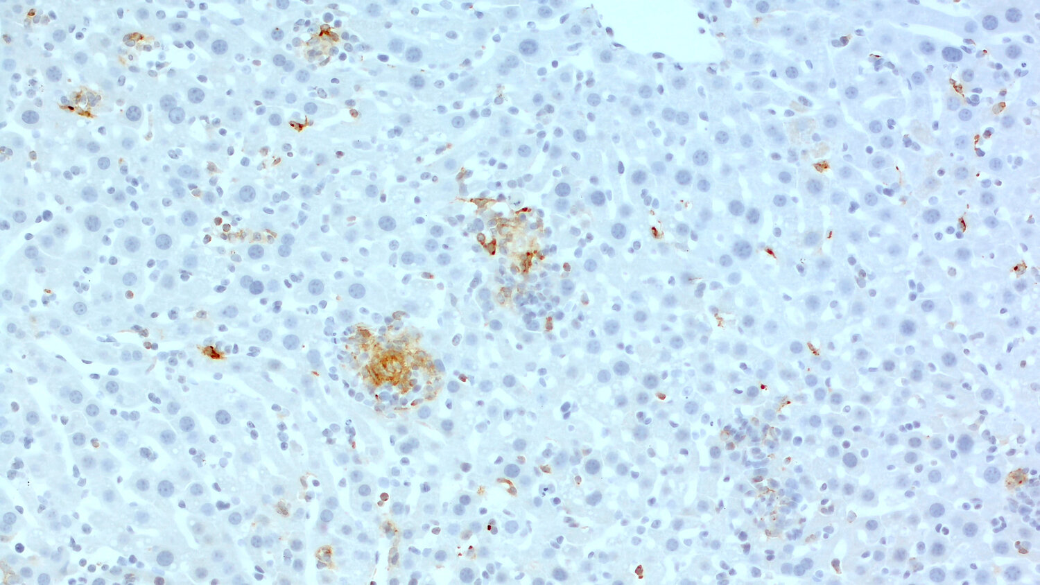 Figure 3: Immunohistochemical staining of formalin-fixed paraffin embedded mouse liver sections of A a naïve control mouse and B a mouse with systemic T. gondii infection using rabbit anti-CD11c (HS-375 003, 1:100, DAB). Nuclei were counterstained with hematoxylin (blue).